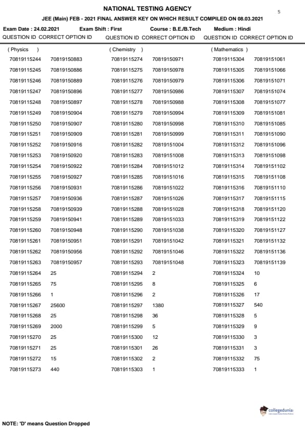 | JEE MAIN 2021 प्रश्न पत्र | JEE MAIN 2021 उत्तर कुंजी |