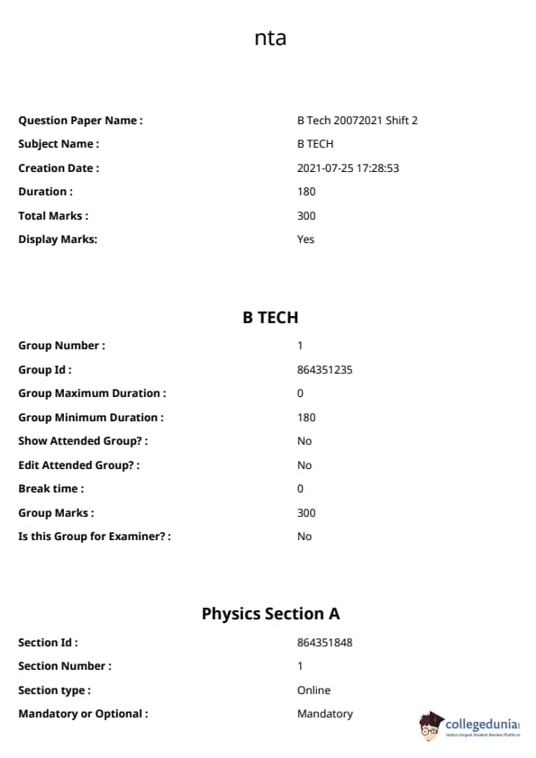 JEE Main बी.ई/बी.टेक प्रश्न पत्र- 20 जुलाई, 2021 दोपहर