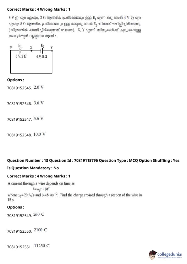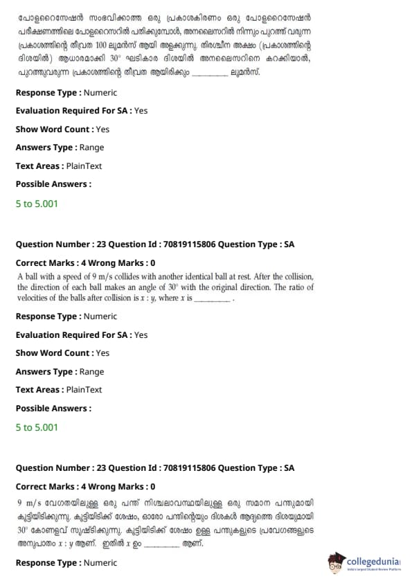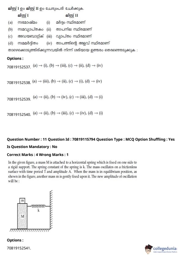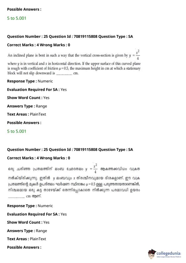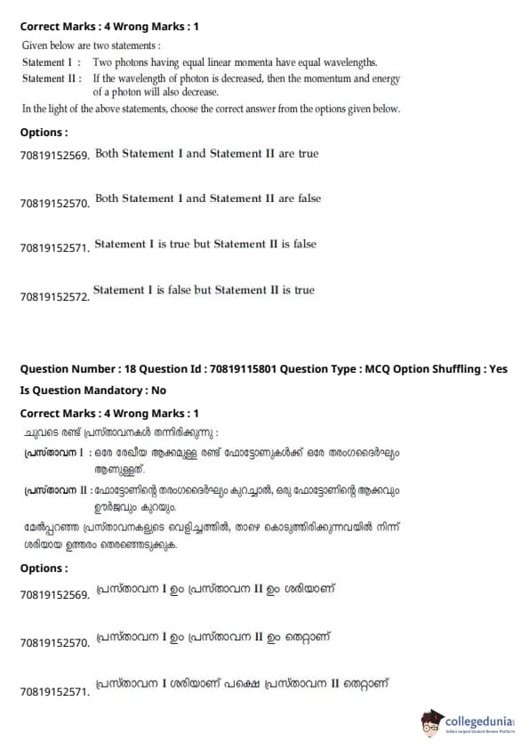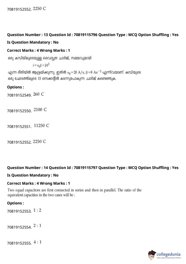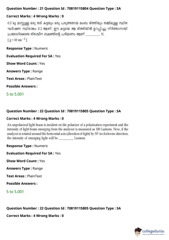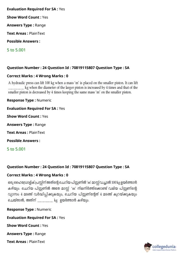 - മറ്റ് വിഭാഗങ്ങളെ അപേക്ഷിച്ച് ഫിസിക്സ് വിഭാഗം താരതമ്യേന എളുപ്പമായിരുന്നു. കണക്കുകൂട്ടലുകളെ അടിസ്ഥാനമാക്കിയുള്ള ചോദ്യങ്ങളുടെ എണ്ണം തിയറി അടിസ്ഥാനമാക്കിയുള്ള ചോദ്യങ്ങളേക്കാൾ കൂടുതലാണെങ്കിലും, അവ കൂടുതലും ഹ്രസ്വവും നേരിട്ടുള്ള സൂത്രവാക്യത്തിന്റെ ഒന്നോ അല്ലെങ്കിൽ മറ്റ് വ്യതിയാനങ്ങളും ഉൾക്കൊള്ളുന്നതായിരുന്നു.