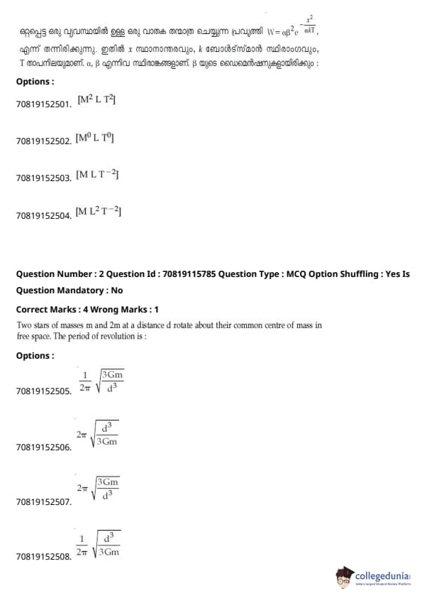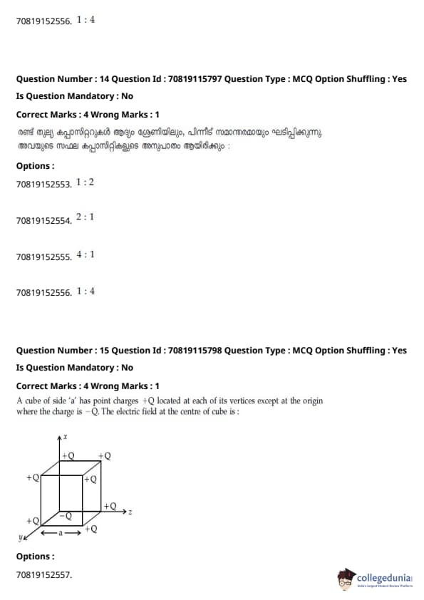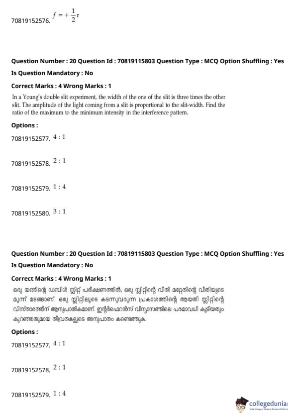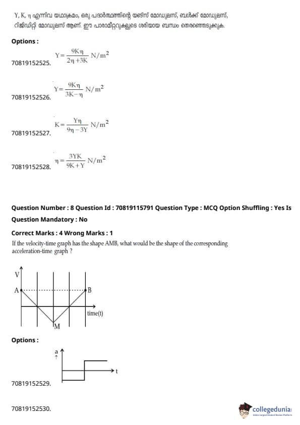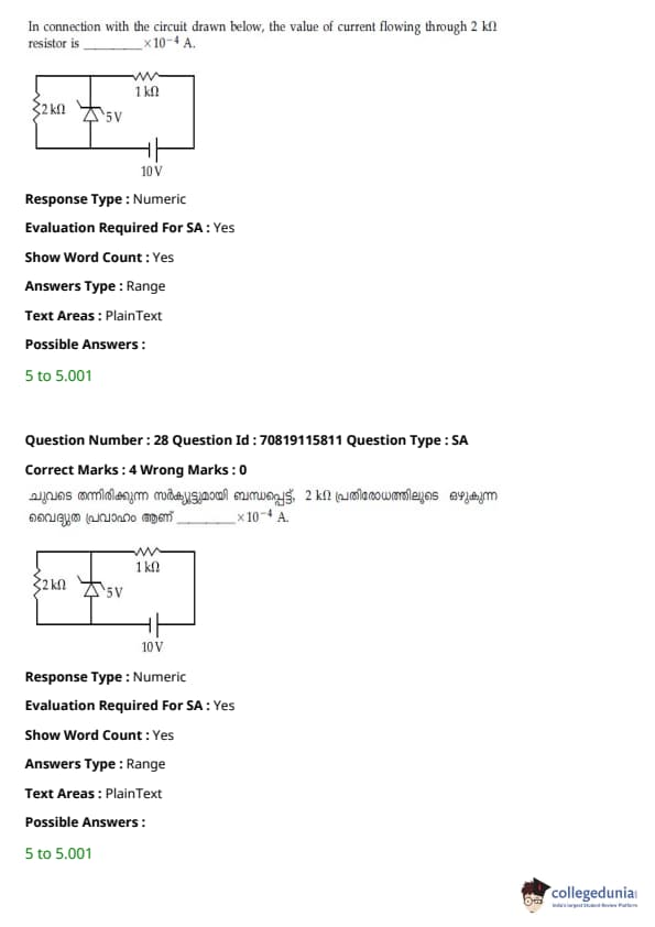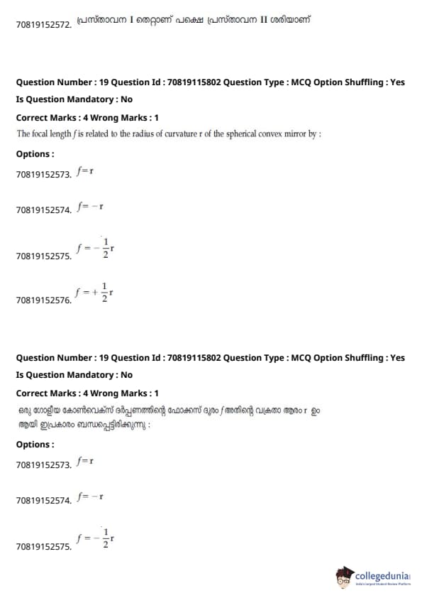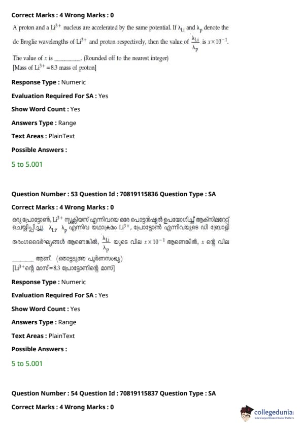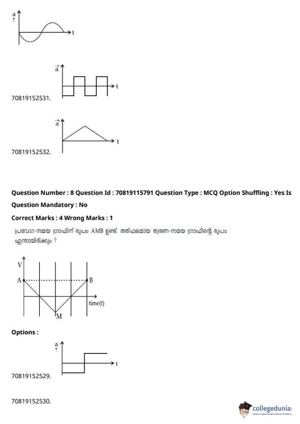 - മറ്റ് വിഭാഗങ്ങളെ അപേക്ഷിച്ച് ഫിസിക്സ് വിഭാഗം താരതമ്യേന എളുപ്പമായിരുന്നു. കണക്കുകൂട്ടലുകളെ അടിസ്ഥാനമാക്കിയുള്ള ചോദ്യങ്ങളുടെ എണ്ണം തിയറി അടിസ്ഥാനമാക്കിയുള്ള ചോദ്യങ്ങളേക്കാൾ കൂടുതലാണെങ്കിലും, അവ കൂടുതലും ഹ്രസ്വവും നേരിട്ടുള്ള സൂത്രവാക്യത്തിന്റെ ഒന്നോ അല്ലെങ്കിൽ മറ്റ് വ്യതിയാനങ്ങളും ഉൾക്കൊള്ളുന്നതായിരുന്നു.
