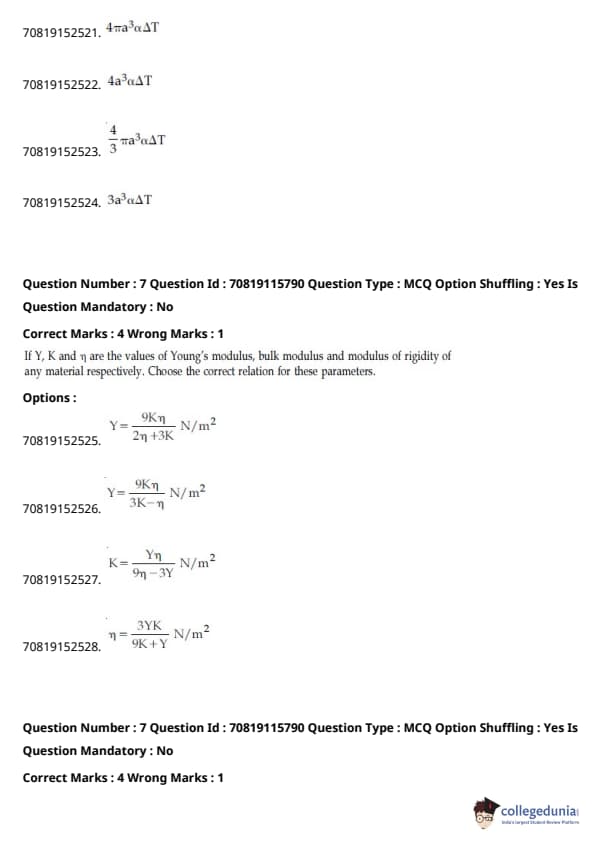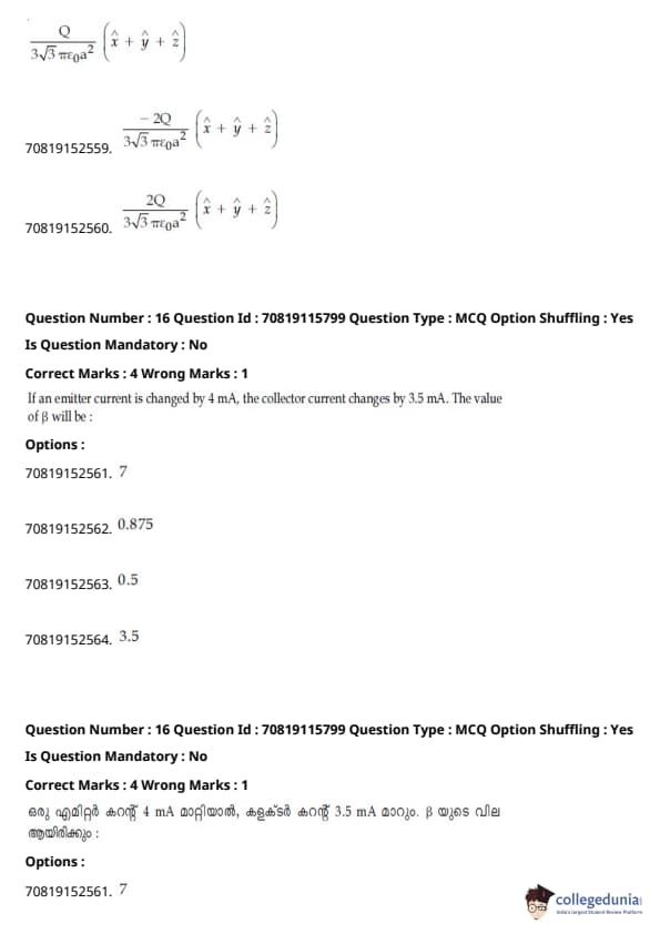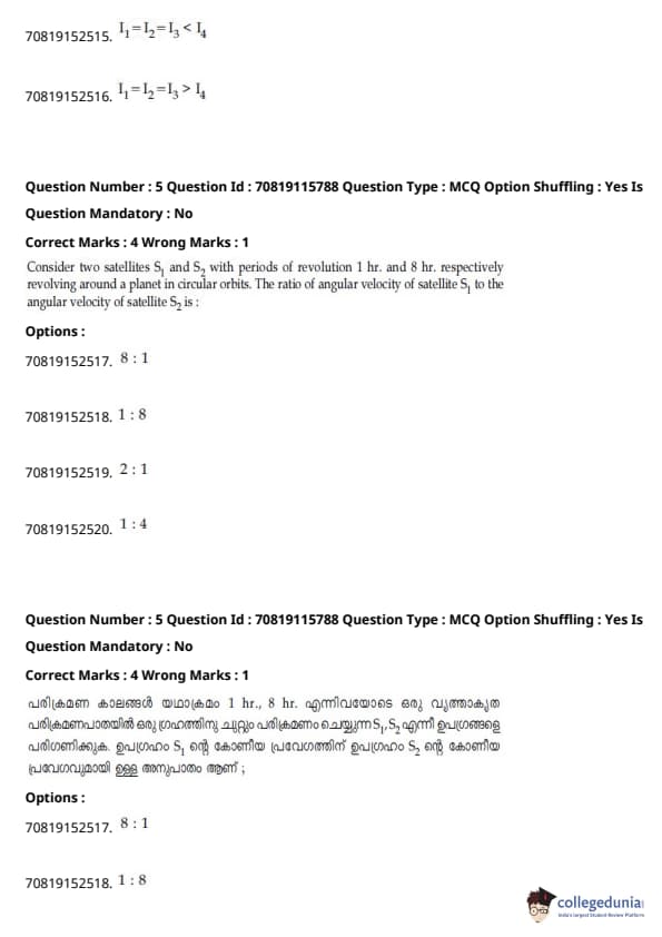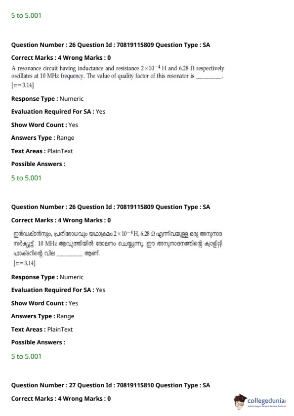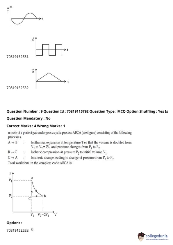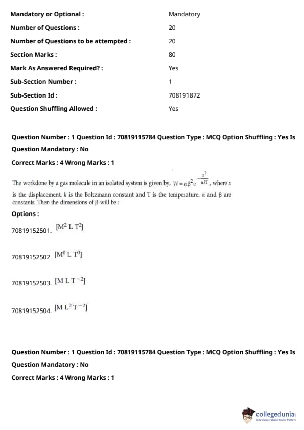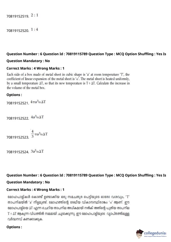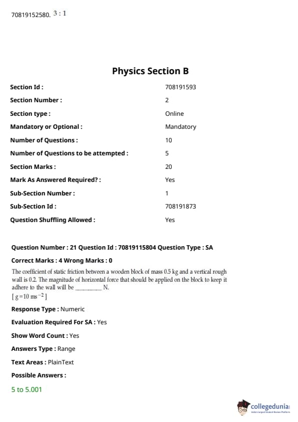 - മറ്റ് വിഭാഗങ്ങളെ അപേക്ഷിച്ച് ഫിസിക്സ് വിഭാഗം താരതമ്യേന എളുപ്പമായിരുന്നു. കണക്കുകൂട്ടലുകളെ അടിസ്ഥാനമാക്കിയുള്ള ചോദ്യങ്ങളുടെ എണ്ണം തിയറി അടിസ്ഥാനമാക്കിയുള്ള ചോദ്യങ്ങളേക്കാൾ കൂടുതലാണെങ്കിലും, അവ കൂടുതലും ഹ്രസ്വവും നേരിട്ടുള്ള സൂത്രവാക്യത്തിന്റെ ഒന്നോ അല്ലെങ്കിൽ മറ്റ് വ്യതിയാനങ്ങളും ഉൾക്കൊള്ളുന്നതായിരുന്നു.