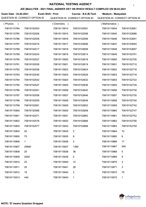 | JEE Main 2021 ചോദ്യപേപ്പർ | JEE Main 2021 ഉത്തരം കീ |