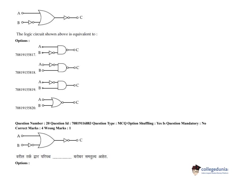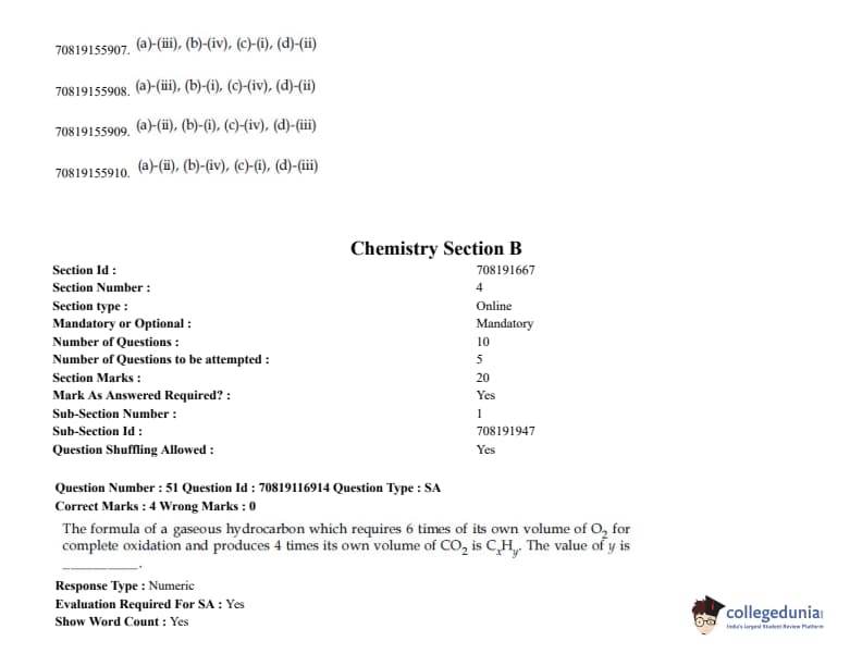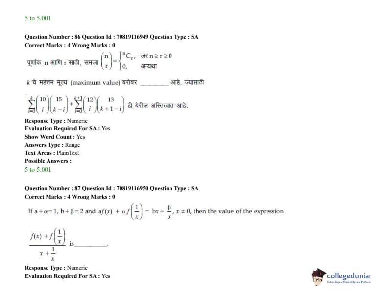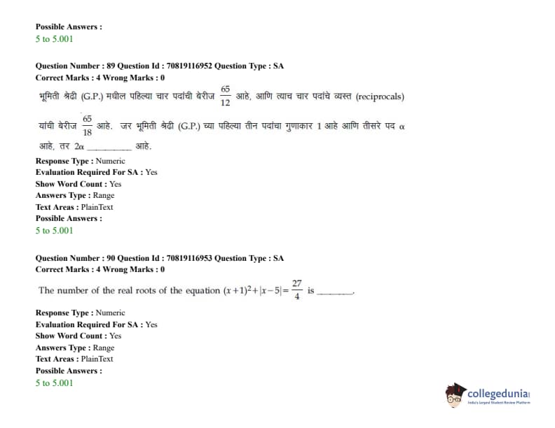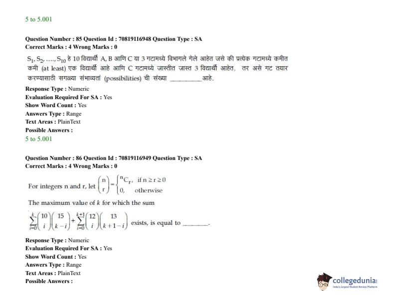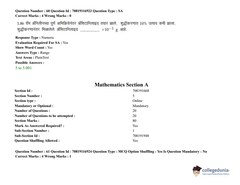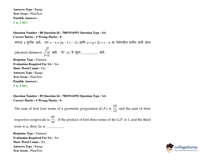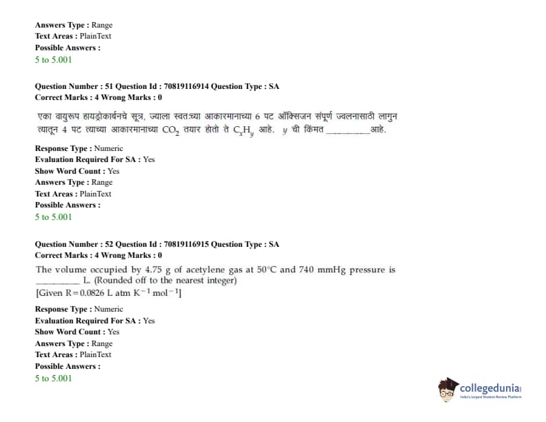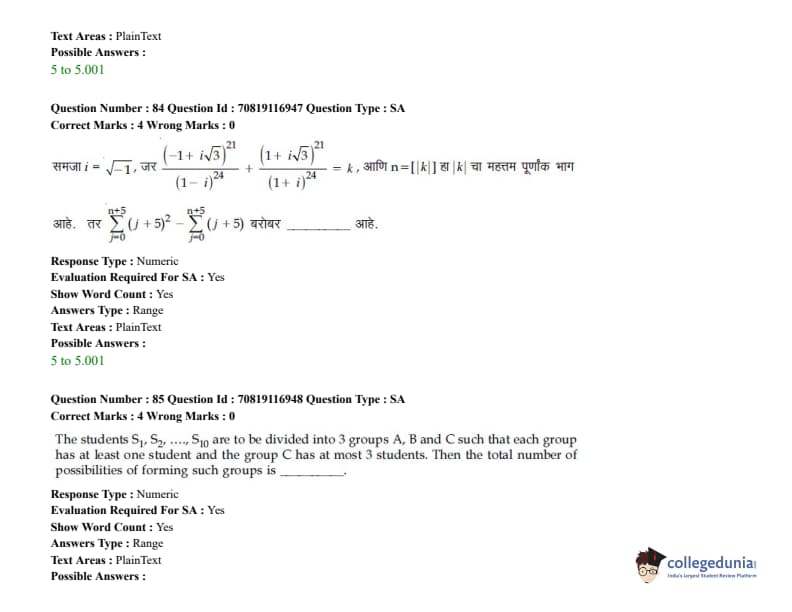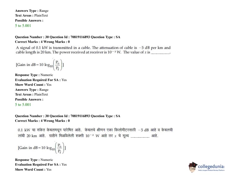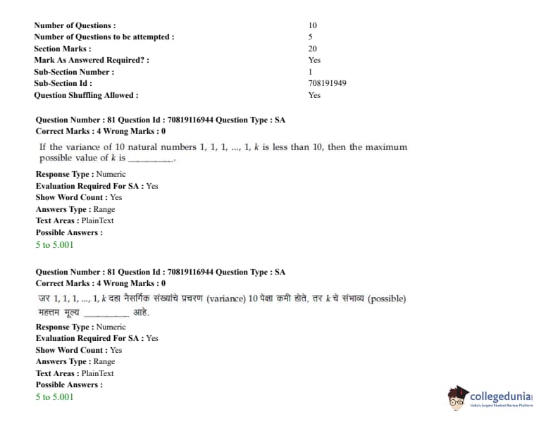 - प्रत्येक विभागात 10 पूर्णांक प्रकारचे संख्यात्मक उत्तर प्रश्न होते, त्यापैकी उमेदवाराने कोणतेही 5 प्रयत्न करणे आवश्यक होते.