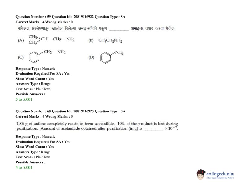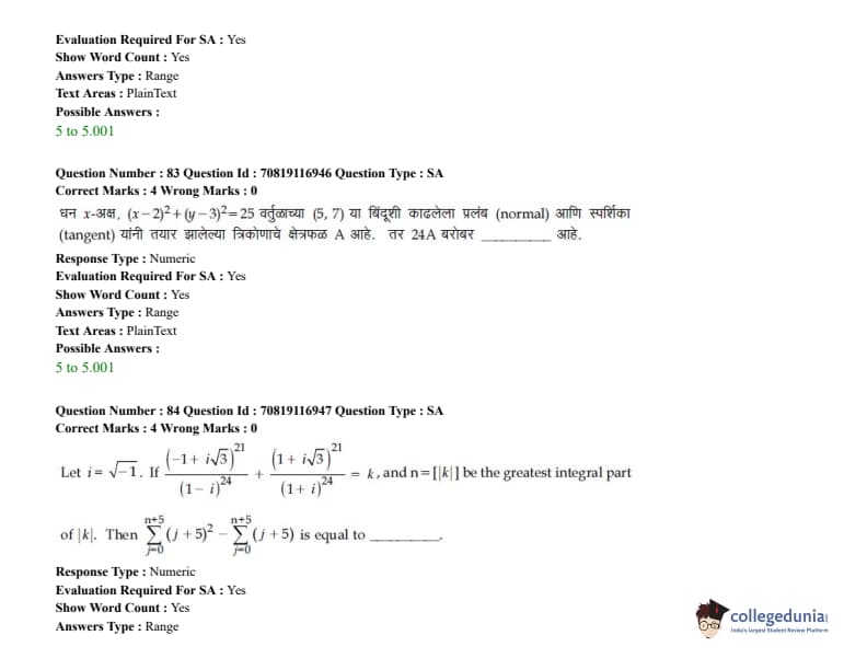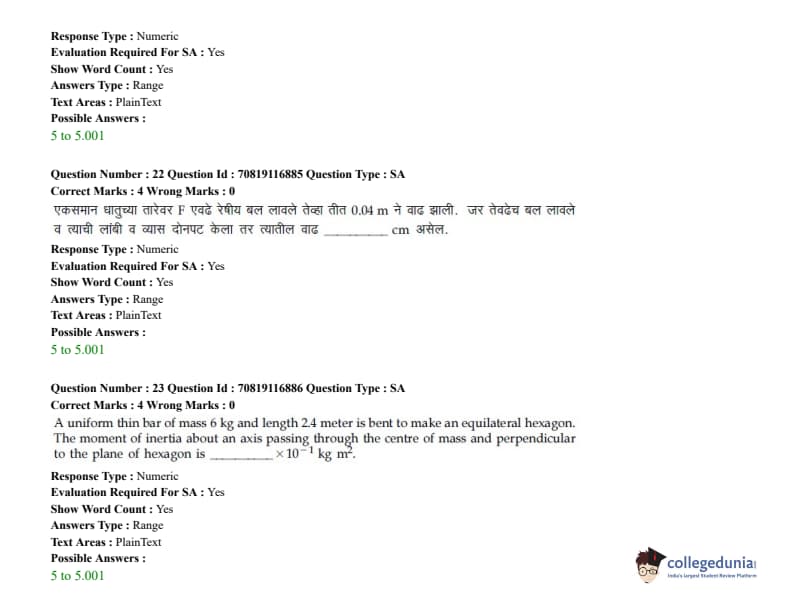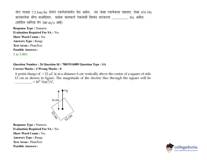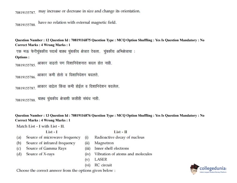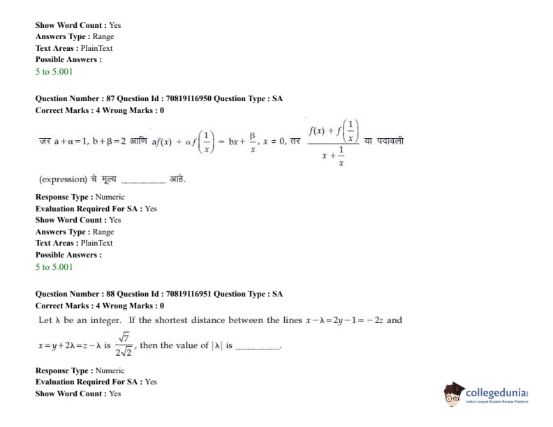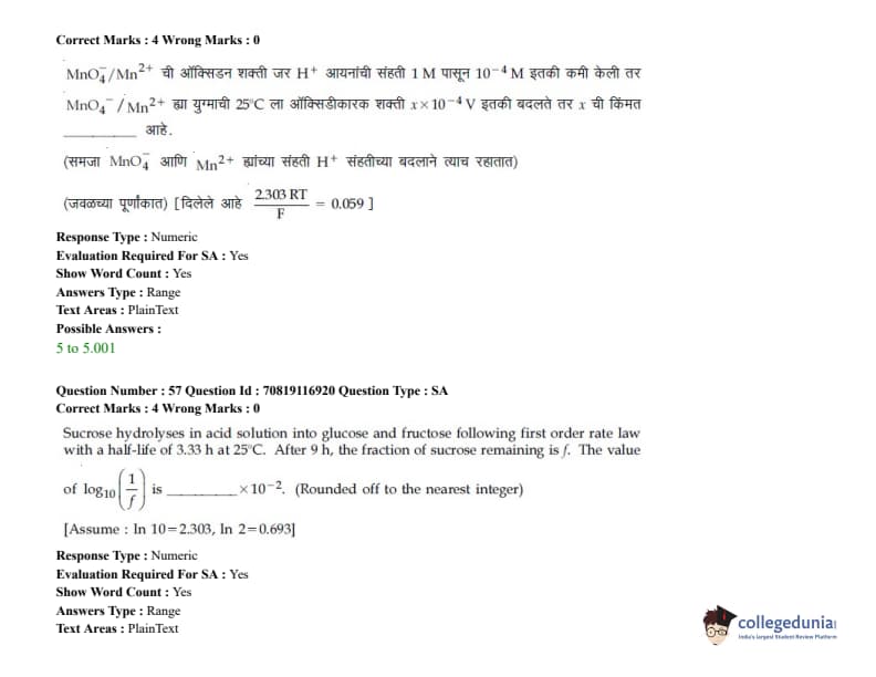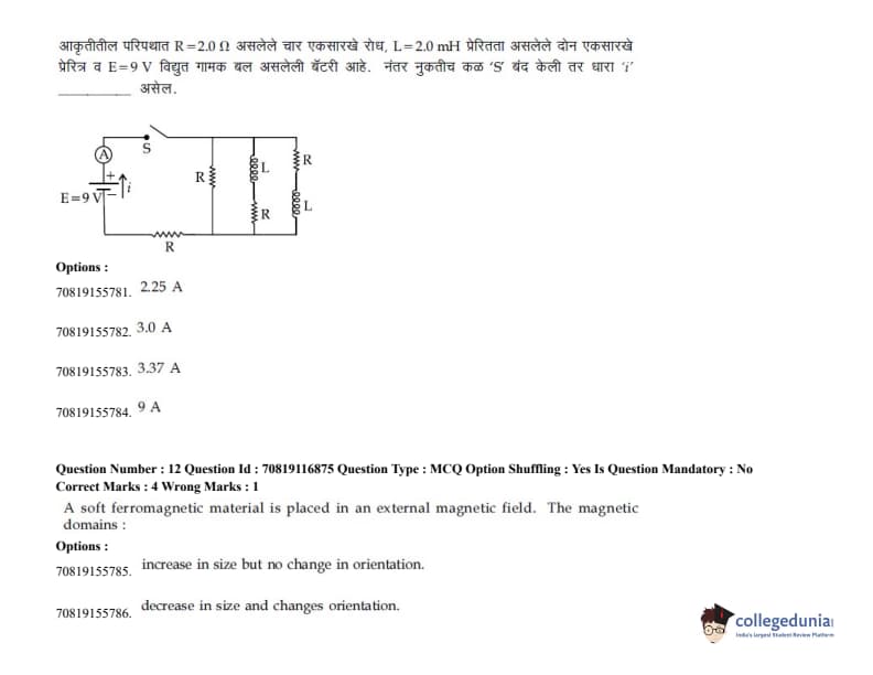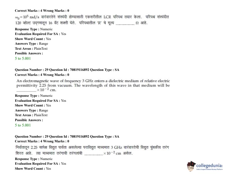 JEE Main 2021 B.E./B.Tech प्रश्नपत्रिका - 24 फेब्रुवारी 2021- दुपारचे सत्र मध्यम अडचणीचे मानले जात होते. 2021 च्या नवीन JEE Main परीक्षेच्या पॅटर्ननुसार, पेपरमध्ये एकूण 90 प्रश्न होते, त्यापैकी उमेदवारांना 75 प्रश्नांचा प्रयत्न करावा लागला. प्रत्येक विभागातील उमेदवाराला 10 संख्यात्मक उत्तर प्रकारच्या प्रश्नांपैकी कोणतेही 5 प्रयत्न करण्याचा पर्याय देण्यात आला होता. गणित हा पेपरमधील सर्वात कठीण विभाग होता, त्यानंतर भौतिकशास्त्र हा विषय होता. रसायनशास्त्र हा पेपरचा सर्वात सोपा विभाग होता ज्यामध्ये थेट सूत्र आणि समीकरणावर आधारित प्रश्न होते. JEE Main 2022 परीक्षेसाठी इच्छुक उमेदवार सरावासाठी 24 फेब्रुवारी 2021 सत्रासाठी उत्तर की पीडीएफसह JEE Main प्रश्नपत्रिका डाउनलोड करू शकतात.