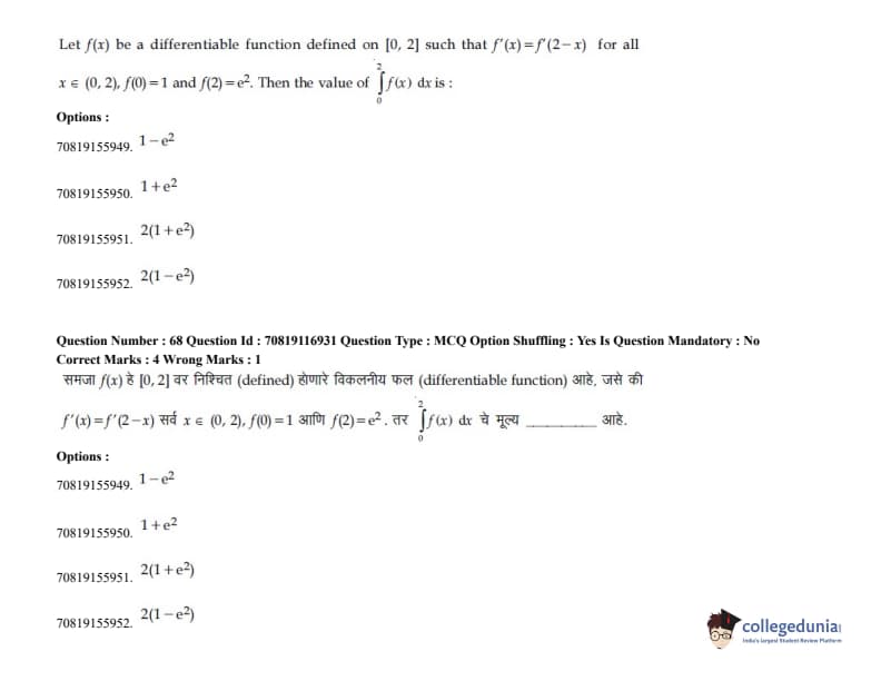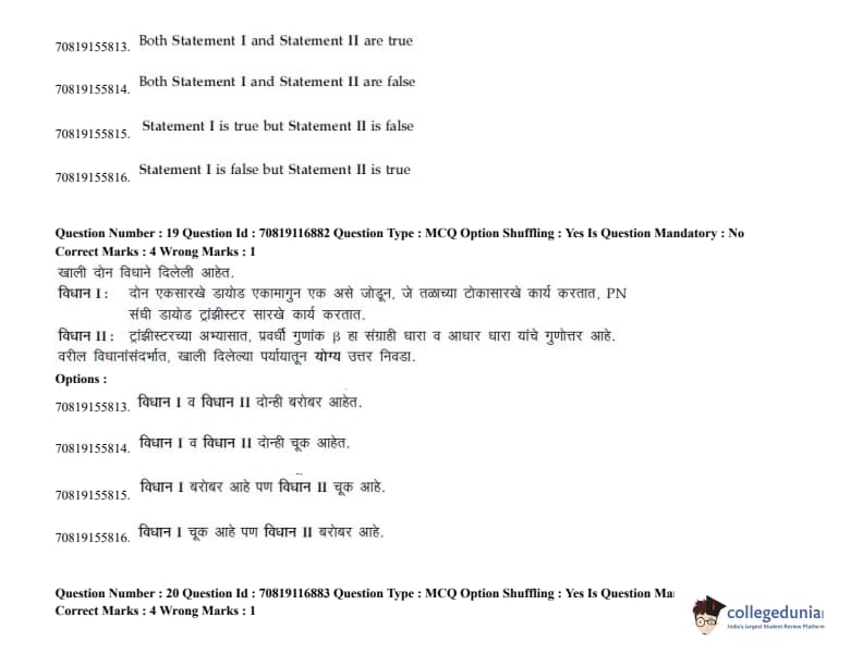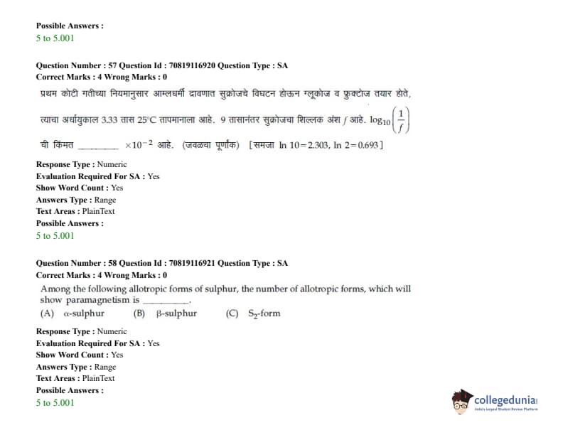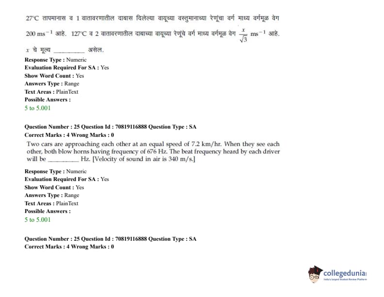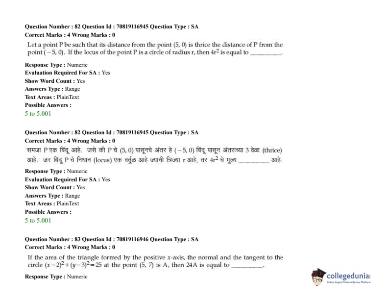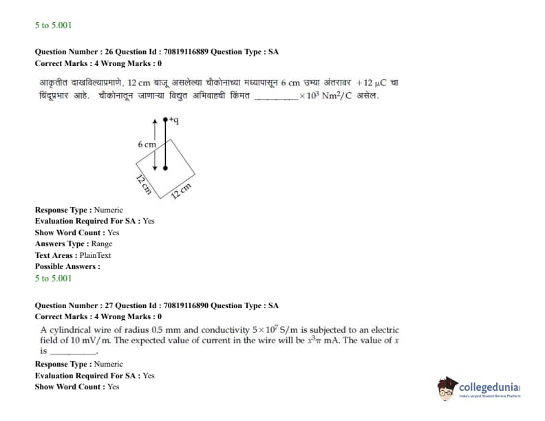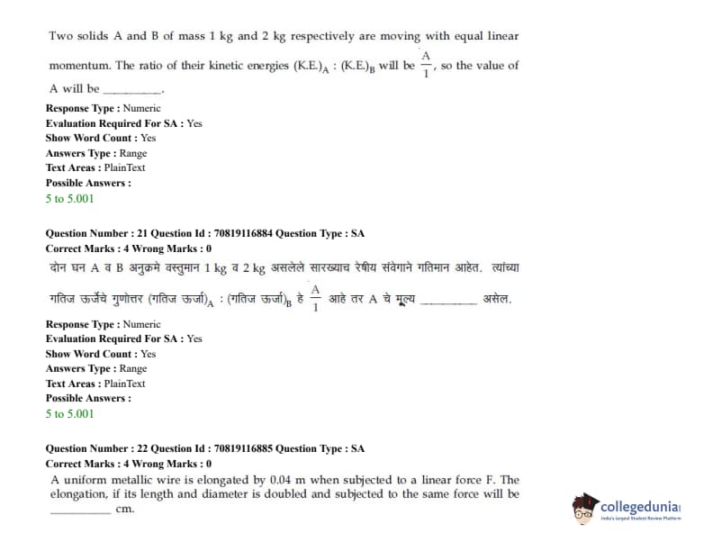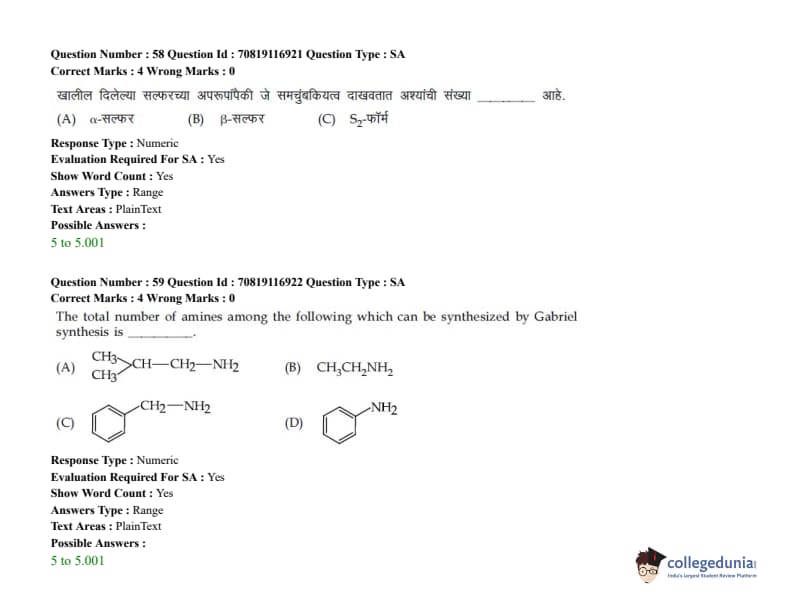 JEE Main 2021 B.E./B.Tech प्रश्नपत्रिका - 24 फेब्रुवारी 2021- दुपारचे सत्र मध्यम अडचणीचे मानले जात होते. 2021 च्या नवीन JEE Main परीक्षेच्या पॅटर्ननुसार, पेपरमध्ये एकूण 90 प्रश्न होते, त्यापैकी उमेदवारांना 75 प्रश्नांचा प्रयत्न करावा लागला. प्रत्येक विभागातील उमेदवाराला 10 संख्यात्मक उत्तर प्रकारच्या प्रश्नांपैकी कोणतेही 5 प्रयत्न करण्याचा पर्याय देण्यात आला होता. गणित हा पेपरमधील सर्वात कठीण विभाग होता, त्यानंतर भौतिकशास्त्र हा विषय होता. रसायनशास्त्र हा पेपरचा सर्वात सोपा विभाग होता ज्यामध्ये थेट सूत्र आणि समीकरणावर आधारित प्रश्न होते. JEE Main 2022 परीक्षेसाठी इच्छुक उमेदवार सरावासाठी 24 फेब्रुवारी 2021 सत्रासाठी उत्तर की पीडीएफसह JEE Main प्रश्नपत्रिका डाउनलोड करू शकतात.