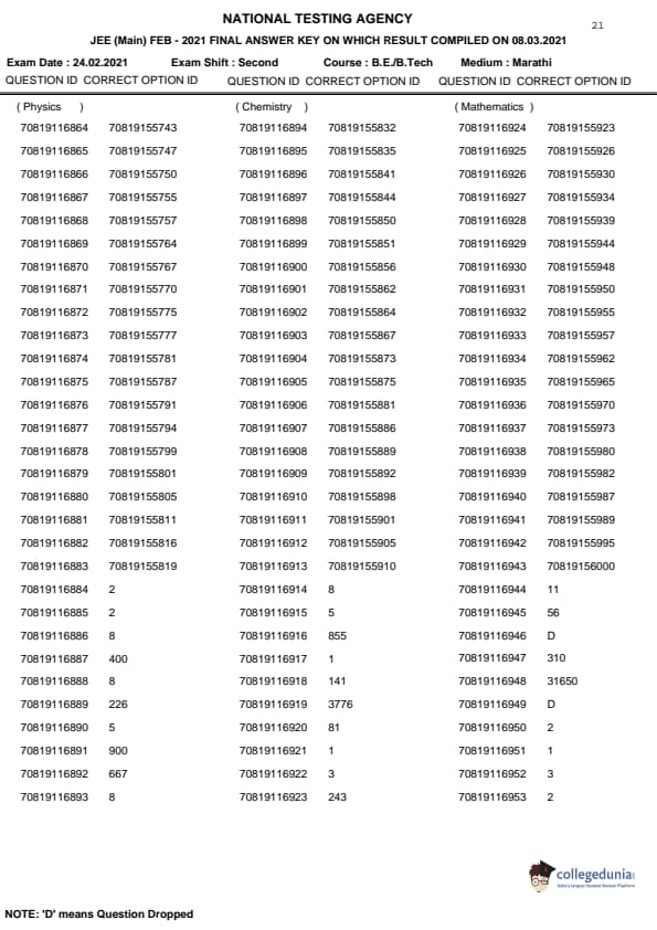 JEE Main २०२१ B.E./B.Tech पेपर 24 फेब्रुवारी दुपारचे सत्र दुपारी 3.00 ते 6.00 या वेळेत घेण्यात आले.