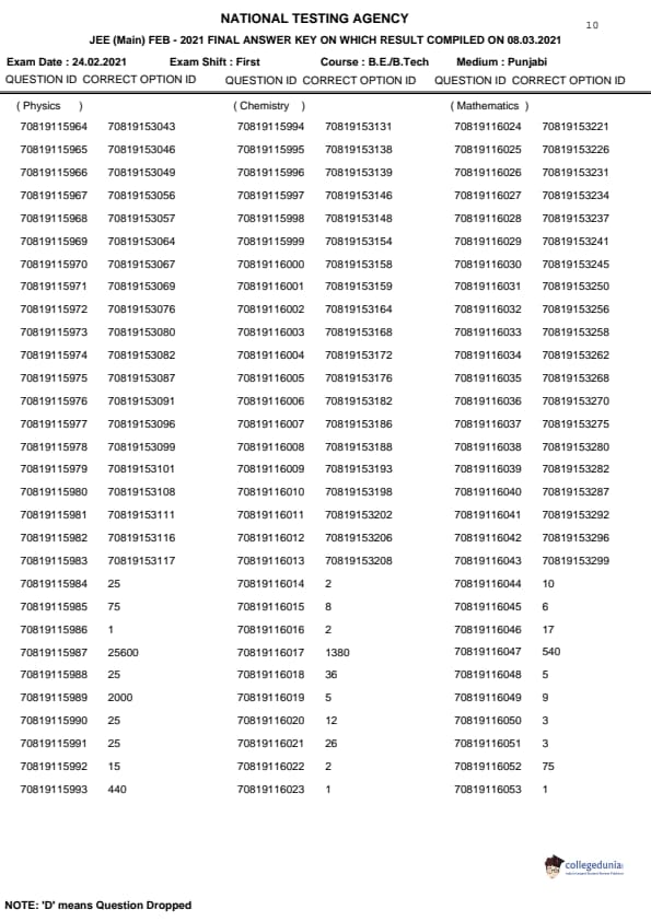 | JEE MAIN 2021 ਪ੍ਰਸ਼ਨ ਪੱਤਰ | JEE MAIN 2021 ਉੱਤਰ ਕੁੰਜੀ |