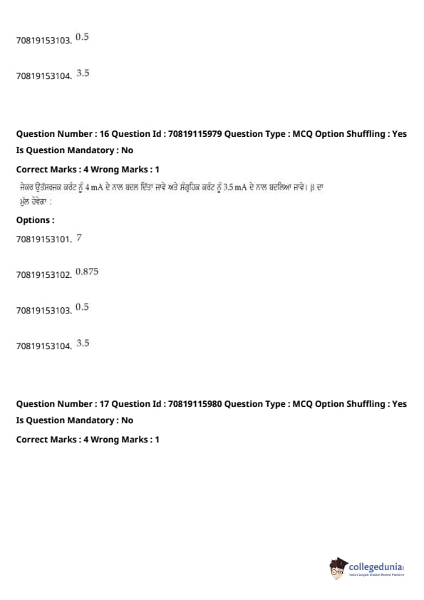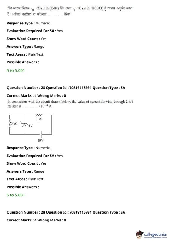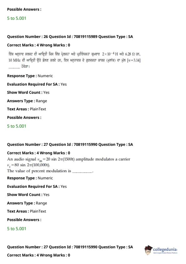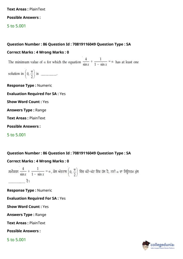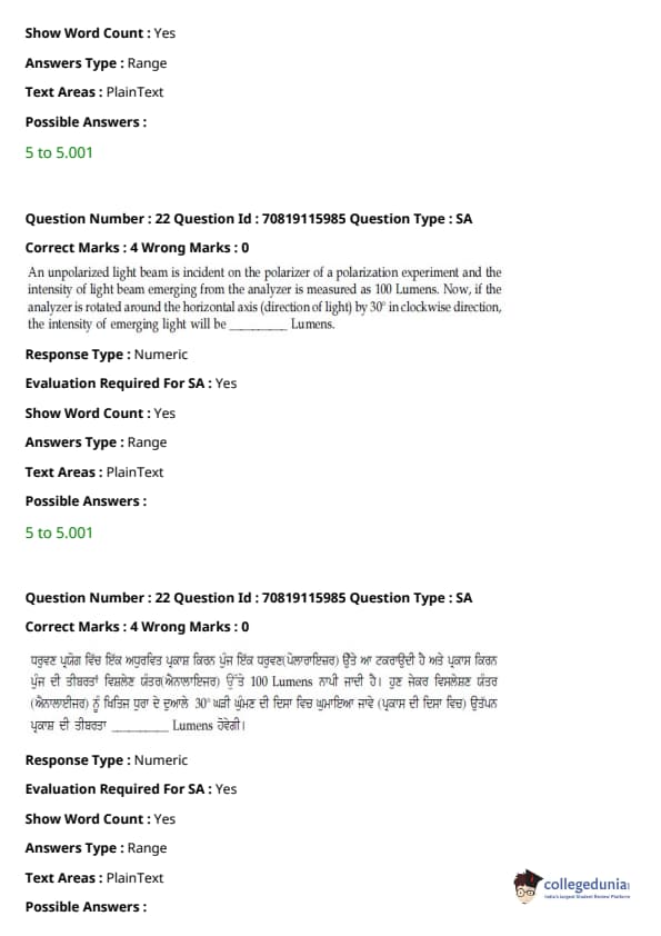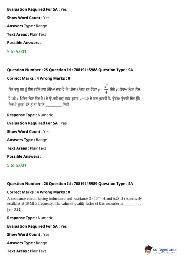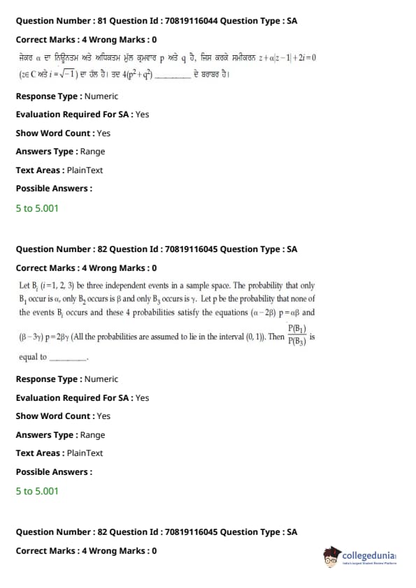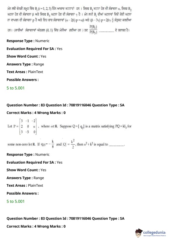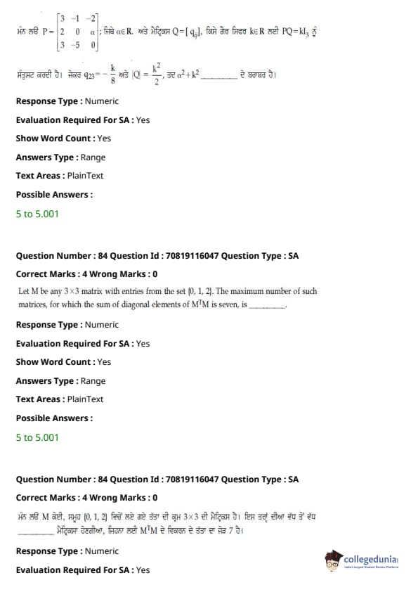 JEE Main 2021 B.E./B.Tech ਪ੍ਰਸ਼ਨ ਪੱਤਰ - 24 ਫਰਵਰੀ, 2021- ਦੁਪਹਿਰ ਦੇ ਸੈਸ਼ਨ ਨੂੰ ਵਿਦਿਆਰਥੀਆਂ ਅਤੇ ਮਾਹਰਾਂ ਦੁਆਰਾ ਸਮੁੱਚੀ ਮੁਸ਼ਕਲ ਦੇ ਰੂਪ ਵਿੱਚ ਮੱਧਮ ਦਰਜਾ ਦਿੱਤਾ ਗਿਆ ਸੀ। ਪੇਪਰ ਨੂੰ ਤਿੰਨ ਭਾਗਾਂ ਦੇ ਮੁਸ਼ਕਲ ਪੱਧਰਾਂ ਦੇ ਰੂਪ ਵਿੱਚ ਚੰਗੀ ਤਰ੍ਹਾਂ ਸੰਤੁਲਿਤ ਵੀ ਕਿਹਾ ਗਿਆ ਸੀ। ਸੰਸ਼ੋਧਿਤ JEE Main ਪ੍ਰੀਖਿਆ ਪੈਟਰਨ ਦੇ ਅਨੁਸਾਰ, ਹਰੇਕ ਭਾਗ ਤੋਂ ਕੁੱਲ 30 ਪ੍ਰਸ਼ਨ ਪੁੱਛੇ ਗਏ ਸਨ, ਸੈਕਸ਼ਨ ਵਿੱਚ ਉਮੀਦਵਾਰ ਦੁਆਰਾ 25 ਪ੍ਰਸ਼ਨਾਂ ਦੀ ਕੋਸ਼ਿਸ਼ ਕੀਤੀ ਜਾਣੀ ਸੀ। JEE Main 2022 ਲਈ ਟੀਚਾ ਰੱਖਣ ਵਾਲੇ ਉਮੀਦਵਾਰ ਅਭਿਆਸ ਅਤੇ ਵਿਸ਼ਲੇਸ਼ਣ ਲਈ ਹੇਠਾਂ ਦਿੱਤੇ ਸੈਸ਼ਨ ਲਈ ਉੱਤਰ ਕੁੰਜੀ PDF ਦੇ ਨਾਲ ਪ੍ਰਸ਼ਨ ਪੱਤਰ ਡਾਊਨਲੋਡ ਕਰ ਸਕਦੇ ਹਨ।