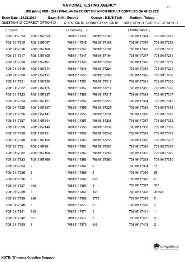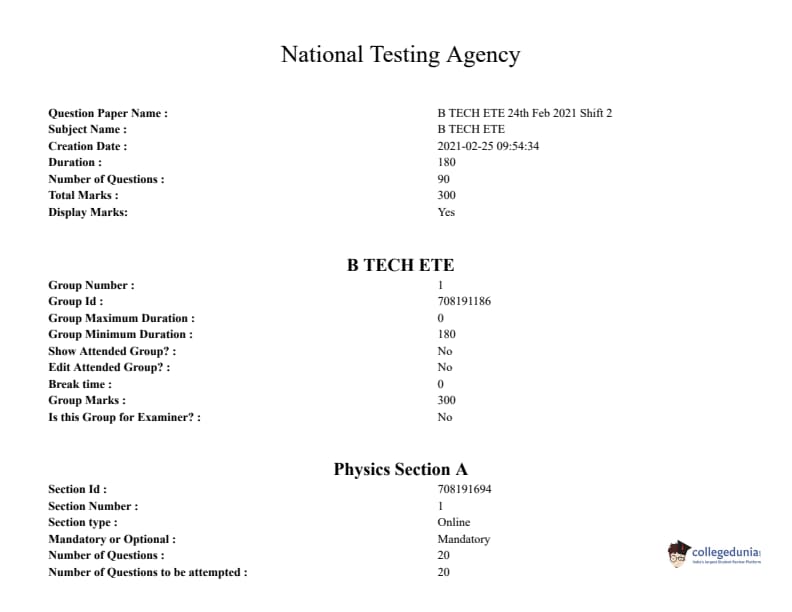 JEE Main 2021 B.E./B.Tech పేపర్ ఫిబ్రవరి 24 మధ్యాహ్నం సెషన్ మధ్యాహ్నం 3.00 నుండి సాయంత్రం 6.00 వరకు నిర్వహించబడింది.