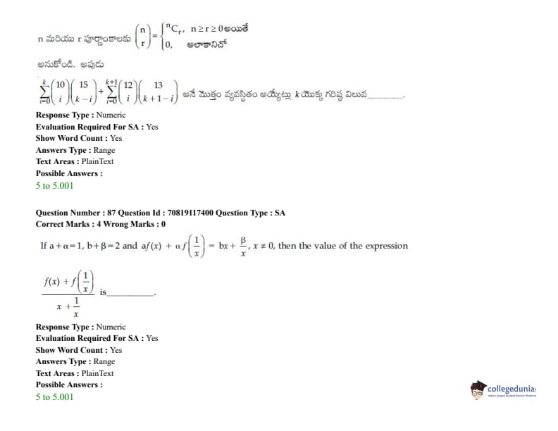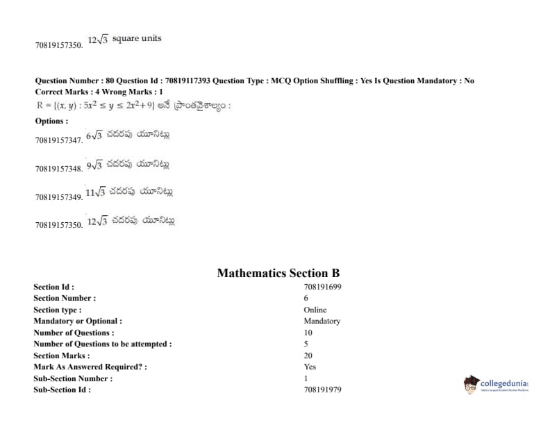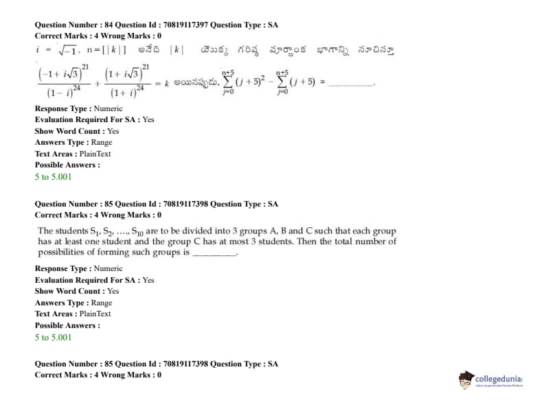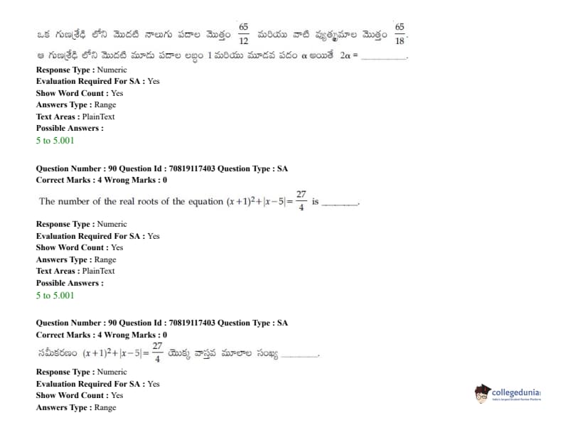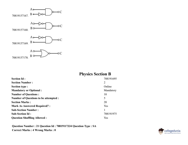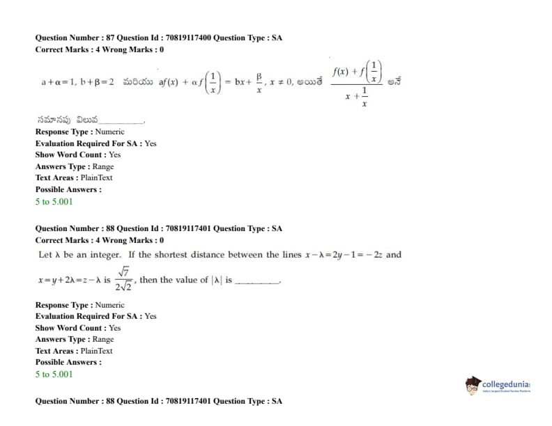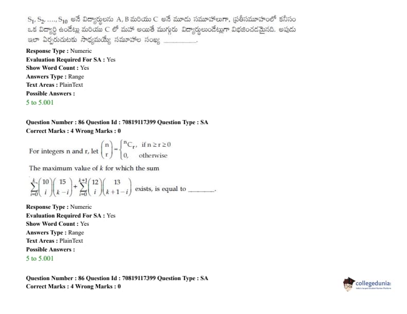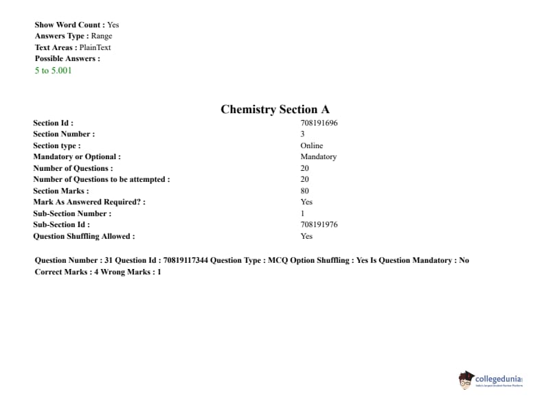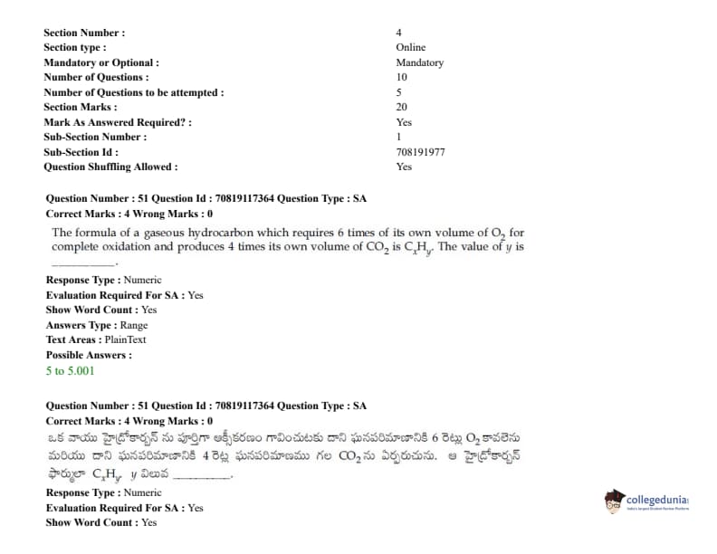 - ప్రతి విభాగంలో 10 పూర్ణాంకాల రకం సంఖ్యాపరమైన సమాధాన ప్రశ్నలు ఉన్నాయి, వీటిలో అభ్యర్థి ఏదైనా 5ని ప్రయత్నించాలి.