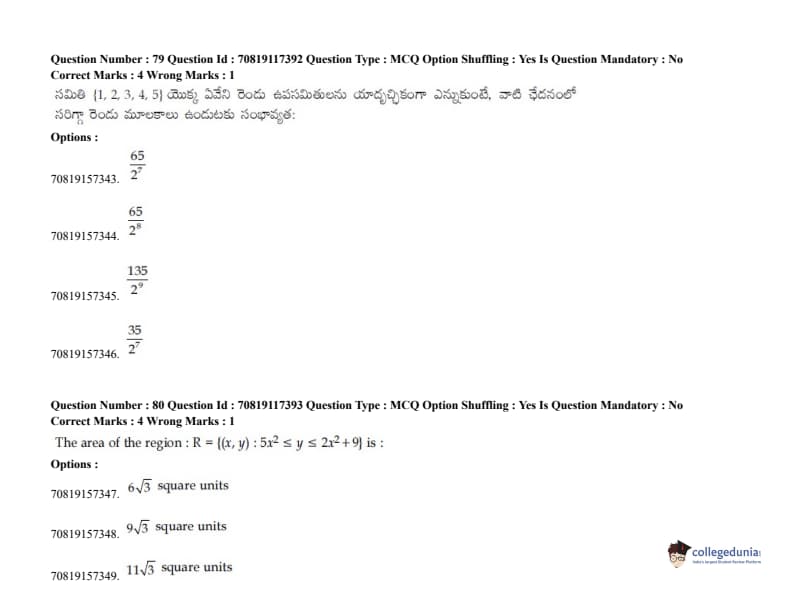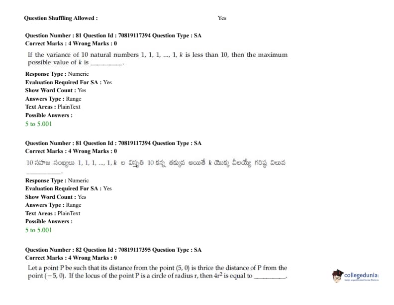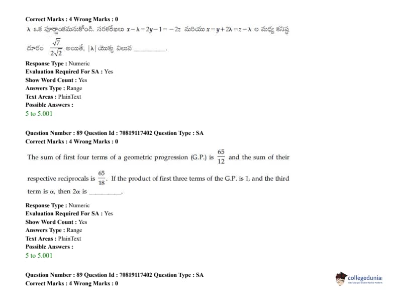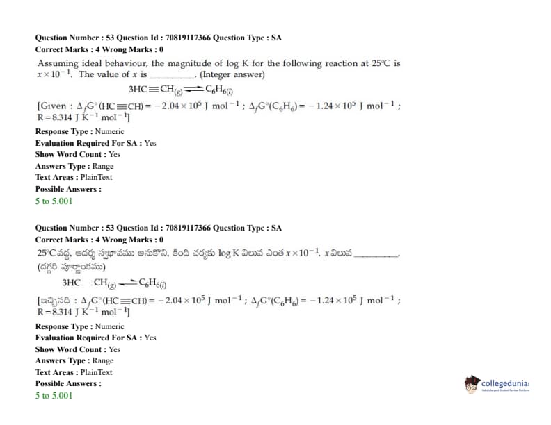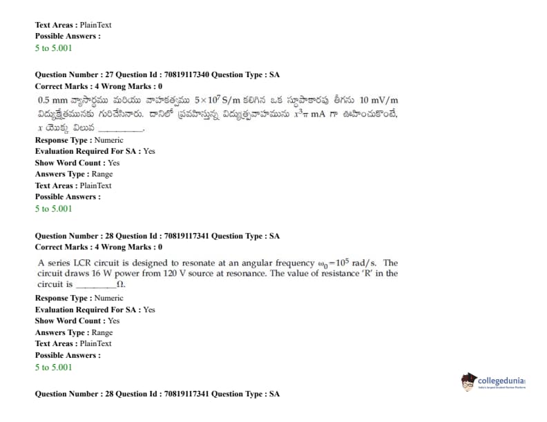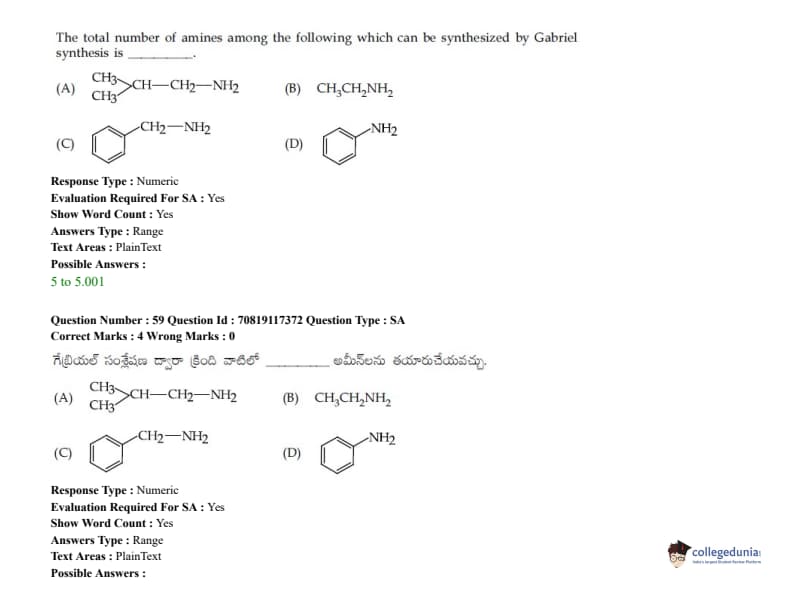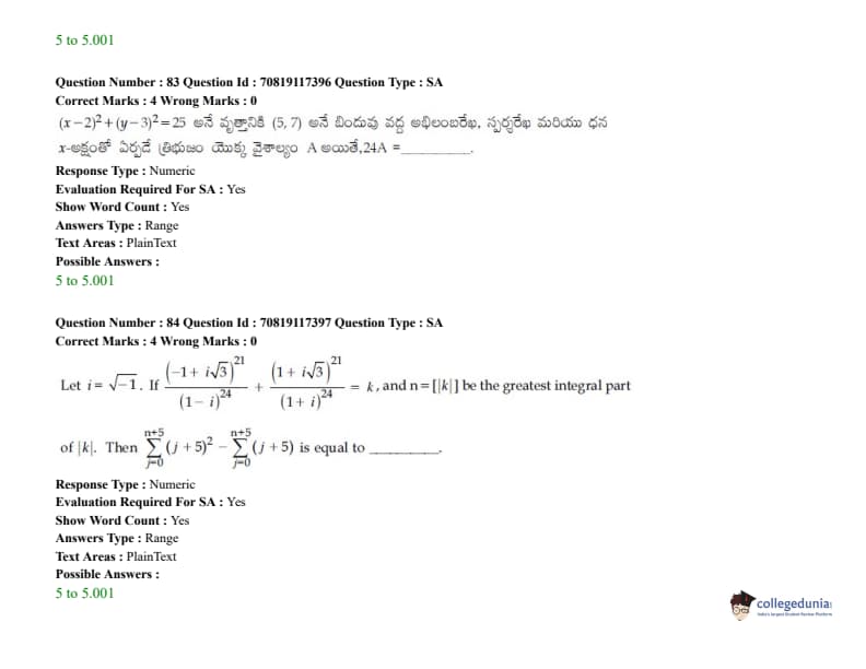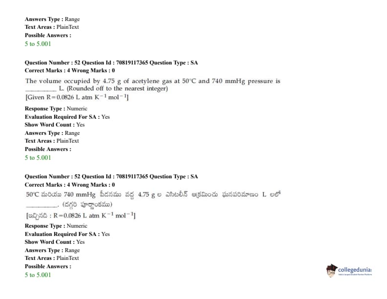 - ప్రతి విభాగంలో 10 పూర్ణాంకాల రకం సంఖ్యాపరమైన సమాధాన ప్రశ్నలు ఉన్నాయి, వీటిలో అభ్యర్థి ఏదైనా 5ని ప్రయత్నించాలి.