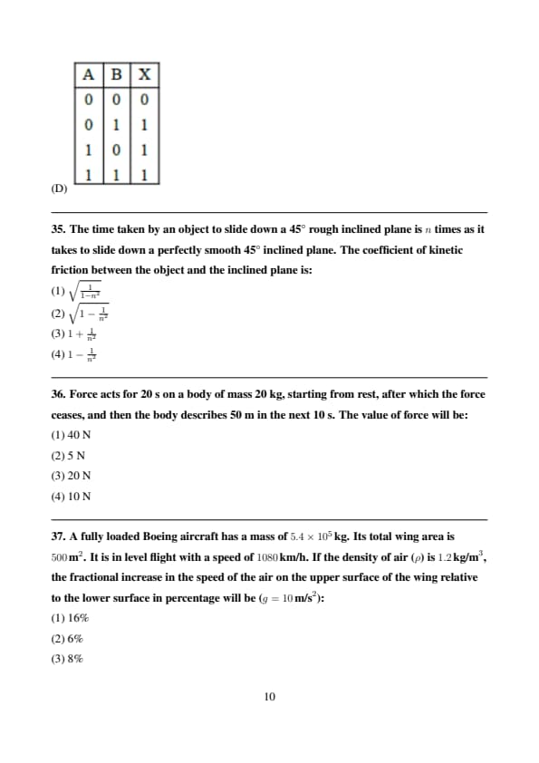The time taken by an object to slide down a 45° rough inclined plane is \(n\) times as it takes to slide down a perfectly smooth 45° inclined plane. The coefficient of kinetic friction between the object and the inclined plane is: