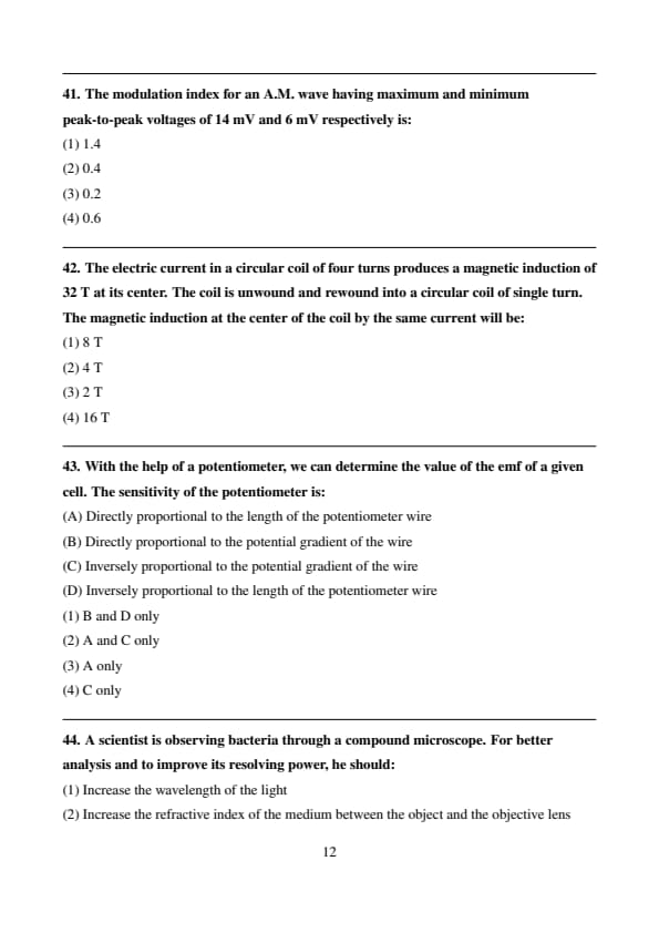 The electric current in a circular coil of four turns produces a magnetic induction of 32 T at its center. The coil is unwound and rewound into a circular coil of single turn. The magnetic induction at the center of the coil by the same current will be: