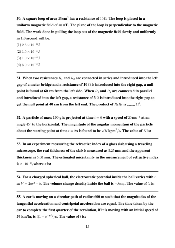 A square loop of area \(25 \, cm^2\) has a resistance of \(10 \, \Omega\). The loop is placed in a uniform magnetic field of \(40.0 \, T\). The plane of the loop is perpendicular to the magnetic field. The work done in pulling the loop out of the magnetic field slowly and uniformly in 1.0 second will be: