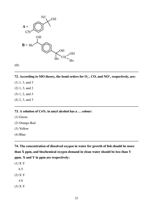 According to MO theory, the bond orders for \(O_2^-\), CO, and NO+, respectively, are:
