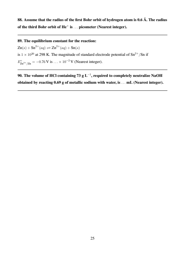is \(1 \times 10^{20}\) at 298 K. The magnitude of standard electrode potential of \(Sn^{2+}/Sn\) if \(E^\circ_{Zn^{2+}/Zn} = -0.76 \, V\) is \(\ldots \times 10^{-2} \, V\) (Nearest integer).
