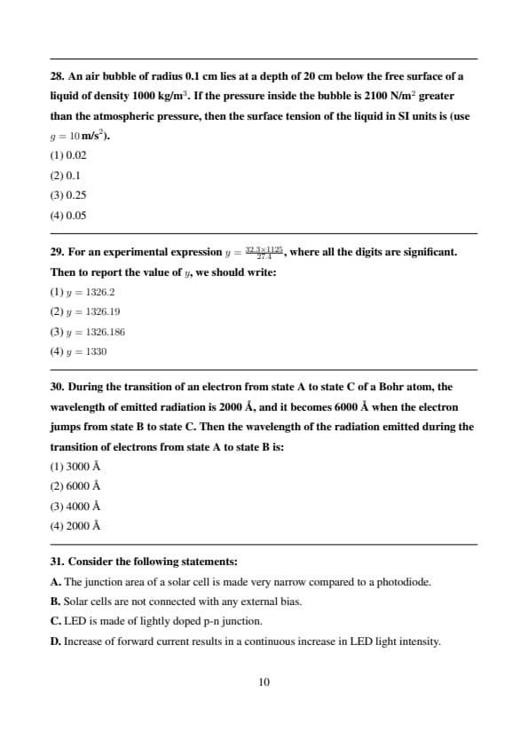 An air bubble of radius 0.1 cm lies at a depth of 20 cm below the free surface of a liquid of density 1000 kg/m\(^3\). If the pressure inside the bubble is 2100 N/m\(^2\) greater than the atmospheric pressure, then the surface tension of the liquid in SI units is (use \(g = 10 \, m/s^2\)).