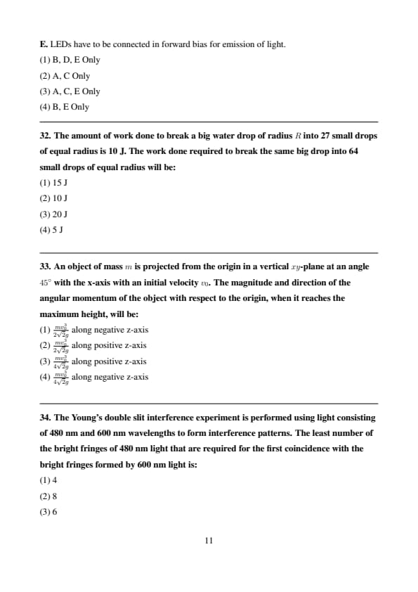 The amount of work done to break a big water drop of radius \( R \) into 27 small drops of equal radius is 10 J. The work done required to break the same big drop into 64 small drops of equal radius will be: