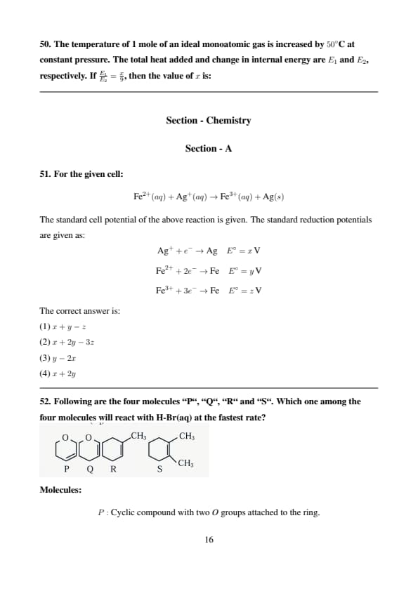The standard cell potential of the above reaction is given. The standard reduction potentials are given as: \[ Ag^+ + e^- \to Ag \quad E^\circ = x \, V \] \[ Fe^{2+} + 2e^- \to Fe \quad E^\circ = y \, V \] \[ Fe^{3+} + 3e^- \to Fe \quad E^\circ = z \, V \]