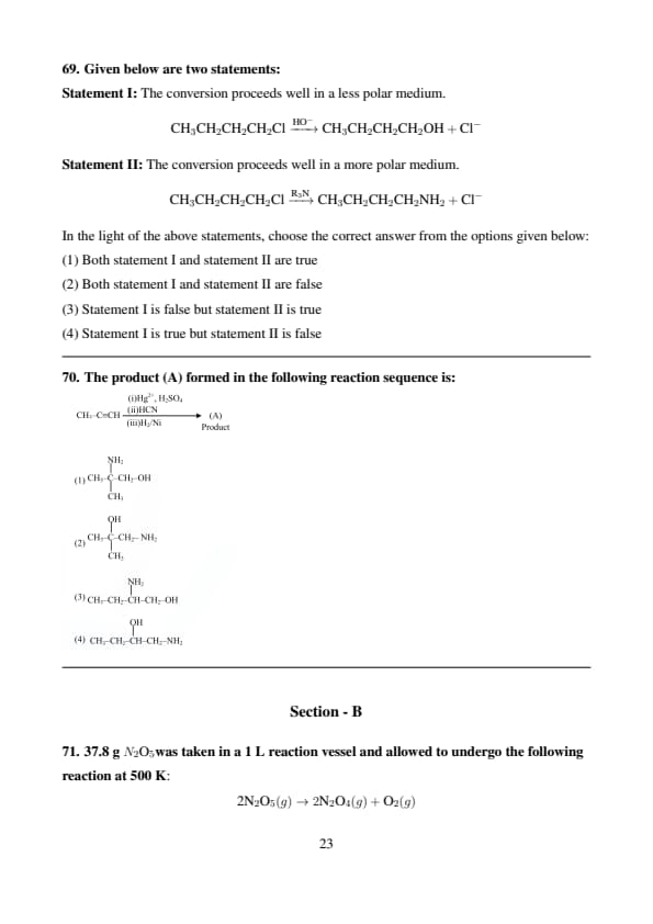Statement II: The conversion proceeds well in a more polar medium. \[ CH_3CH_2CH_2CH_2Cl \xrightarrow{R_3N} CH_3CH_2CH_2CH_2NH_2 + Cl^- \]