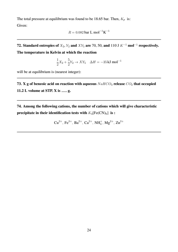 Among the following cations, the number of cations which will give characteristic precipitate in their identification tests with \(K_4\)[Fe(CN)\(_6\)] is : \[ Cu^{2+}, \, Fe^{3+}, \, Ba^{2+}, \, Ca^{2+}, \, NH_4^+, \, Mg^{2+}, \, Zn^{2+} \]
