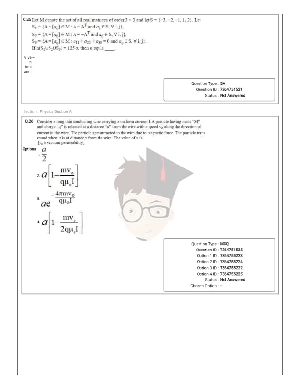 Let \(M\) denote the set of all real matrices of order 3 x 3 and let \(S = \{-3, -2, -1, 1, 2\}\). Let \[ S_1 = \{A = [a_{ij}] \in M : A = A^T \text{ and } a_{ij} \in S, \forall i, j\}, \] \[ S_2 = \{A = [a_{ij}] \in M : A = -A^T \text{ and } a_{ij} \in S, \forall i, j\}, \] \[ S_3 = \{A = [a_{ij}] \in M : a_{11} + a_{22} + a_{33} = 0 \text{ and } a_{ij} \in S, \forall i, j\}. \] If \(n(S_1 \cup S_2 \cup S_3) = 125\), then \(\alpha\) equals: