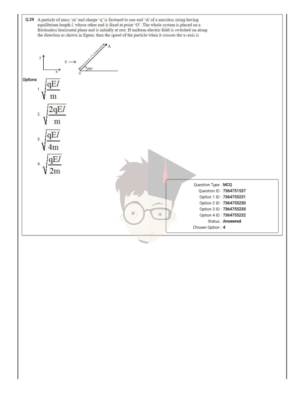 A particle of mass \( m \) and charge \( q \) is fastened to one end \( A \) of a massless string having equilibrium length \( l \), whose other end is fixed at point \( O \). The whole system is placed on a frictionless horizontal plane and is initially at rest. If a uniform electric field is switched on along the direction as shown in the figure, then the speed of the particle when it crosses the x-axis is: