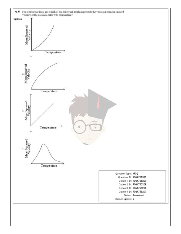 For a particular ideal gas, which of the following graphs represents the variation of mean squared velocity of the gas molecules with temperature?
