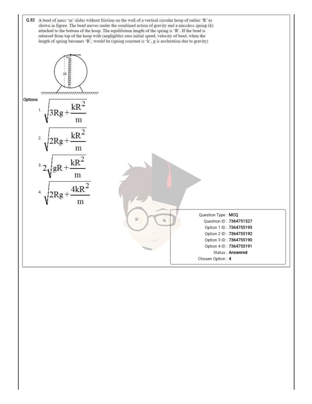 A bead of mass \( m \) slides without friction on the wall of a vertical circular hoop of radius \( R \) as shown in figure. The bead moves under the combined action of gravity and a massless spring \( k \) attached to the bottom of the hoop. The equilibrium length of the spring is \( R \). If the bead is released from the top of the hoop with (negligible) zero initial speed, the velocity of the bead, when the length of spring becomes \( R \), would be (spring constant is \( k \), \( g \) is acceleration due to gravity):