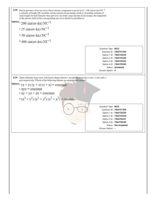 Due to presence of an em-wave whose electric component is given by \( E = 100 \sin(\omega t - kx) \, \text{NC}^{-1} \), a cylinder of length 200 cm holds certain amount of em-energy inside it. If another cylinder of same length but half diameter than previous one holds same amount of em-energy, the magnitude of the electric field of the corresponding em-wave should be modified as: