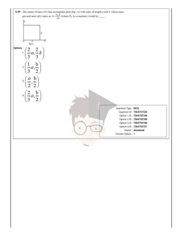 The center of mass of a thin rectangular plate (fig - x) with sides of length \( a \) and \( b \), whose mass per unit area (\( \sigma \)) varies as \( \sigma = \sigma_0 \frac{x}{ab} \) (where \( \sigma_0 \) is a constant), would be