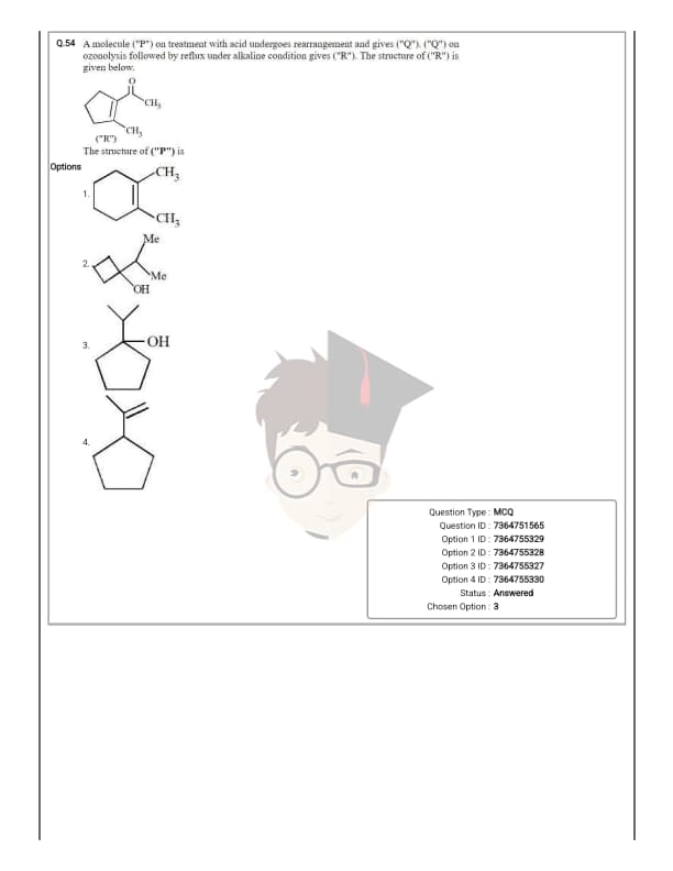 A molecule (P) on treatment with acid undergoes rearrangement and gives (Q). (Q) on ozonolysis followed by reflux under alkaline condition gives (R). The structure of (R) is given below. The structure of (P) is: