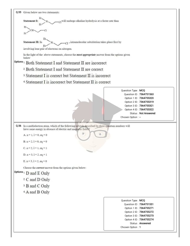 In a multielectron atom, which of the following orbitals described by three quantum numbers will have the same energy in absence of electric and magnetic fields? A. \( n = 1, l = 0, m_l = 0 \) B. \( n = 2, l = 0, m_l = 0 \) C. \( n = 2, l = 1, m_l = 1 \) D. \( n = 3, l = 2, m_l = 1 \) E. \( n = 3, l = 2, m_l = 0 \) Choose the correct answer from the options given below: