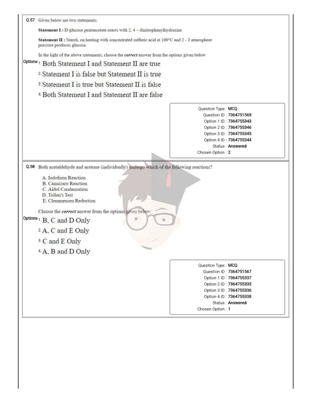 Given below are two statements: Statement I: D-glucose pentaacetate reacts with 2,4-dinitrophenylhydrazine. Statement II: Starch, on heating with concentrated sulfuric acid at 100°C and 2-3 atmosphere pressure, produces glucose. In the light of the above statements, choose the correct answer from the options given below: