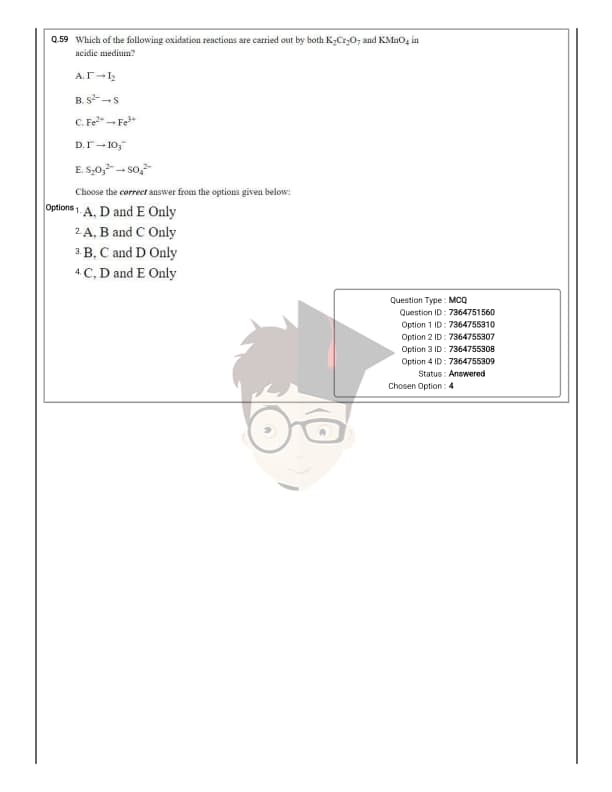 Which of the following oxidation reactions are carried out by both \( K_2Cr_2O_7 \) and \( KMnO_4 \) in acidic medium? A. \( I^- \rightarrow I_2 \) B. \( S^{2-} \rightarrow S \) C. \( Fe^{2+} \rightarrow Fe^{3+} \) D. \( I^- \rightarrow IO_3^- \) E. \( S_2O_3^{2-} \rightarrow SO_4^{2-} \) Choose the correct answer from the options given below: