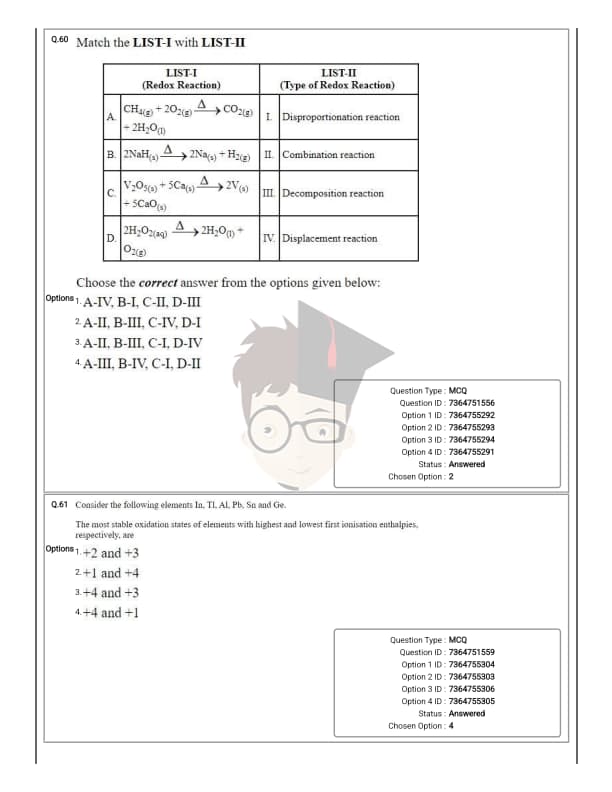 Match the LIST-I with LIST-II (Redox Reactions). \begin{tabular{|c|c| \hline LIST-I (Redox Reaction) & LIST-II (Type of Redox Reaction)