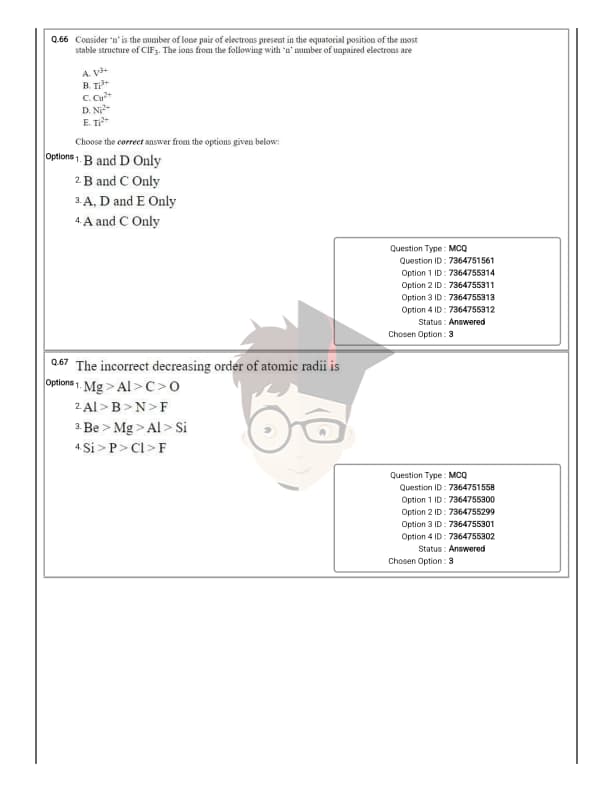 Consider ‘n’ is the number of lone pair of electrons present in the equatorial position of the most stable structure of \( \text{ClF}_3 \). The ions from the following with ‘n’ number of unpaired electrons are: A. \( \text{V}^{3+} \)