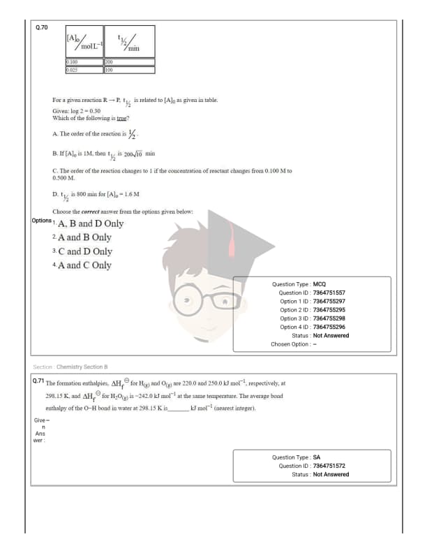 For a given reaction \( R \rightarrow P \), \( t_{1/2} \) is related to \([A_0]\) as given in table. Given: \( \log 2 = 0.30 \). Which of the following is true? \begin{tabular{|c|c| \hline [A] (mol/L) & t$_{1/2}$ (min)