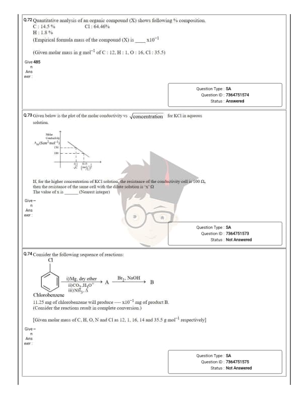 Consider the following sequence of reactions: \includegraphics[width=0.5\linewidth]{74.png 11.25 mg of chlorobenzene will produce \( x \times 10^{-1} \) mg of product B. Consider the reactions result in complete conversation. Given molar mass of C, H, O, N, and Cl as 12, 1, 16, 14, and 35.5 g mol\(^{-1}\), respectively, the value of \( x \) is: