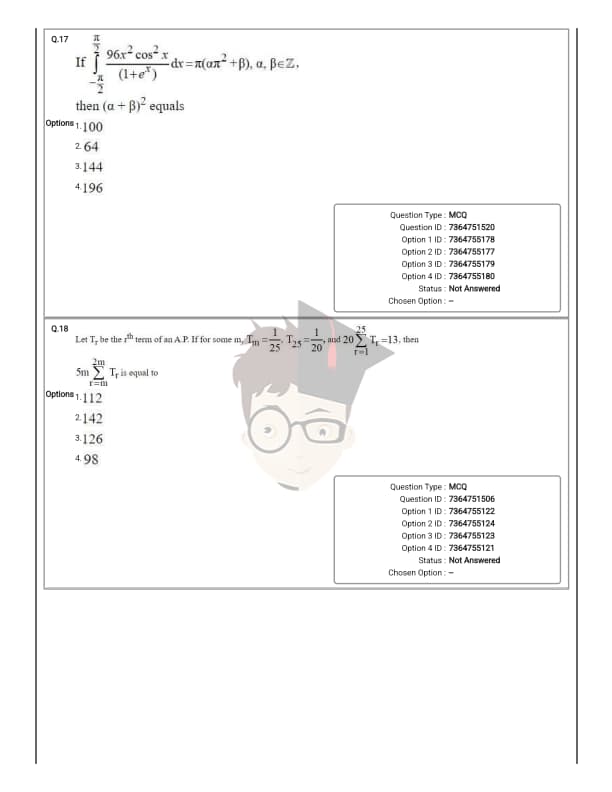 If \[ \int_{-\frac{\pi}{2}}^{\frac{\pi}{2}} \frac{96x^2 \cos^2 x}{1 + e^x} dx = \pi(a\pi^2 + \beta), \quad a, \beta \in \mathbb{Z}, \] then \( (a + \beta)^2 \) equals: