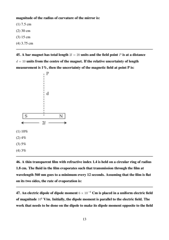 A bar magnet has total length \( 2l = 20 \) units and the field point \( P \) is at a distance \( d = 10 \) units from the centre of the magnet. If the relative uncertainty of length measurement is 1%, then the uncertainty of the magnetic field at point P is: