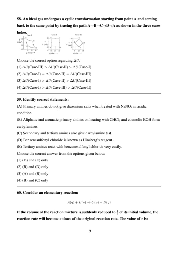 An ideal gas undergoes a cyclic transformation starting from point A and coming back to the same point by tracing the path A→B→C→D→A as shown in the three cases below.