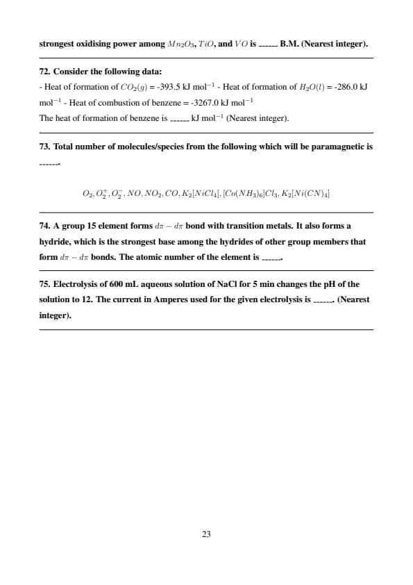 Total number of molecules/species from the following which will be paramagnetic is ______. \[ O_2, O_2^+, O_2^-, NO, NO_2, CO, K_2[NiCl_4], [Co(NH_3)_6]Cl_3, K_2[Ni(CN)_4] \]