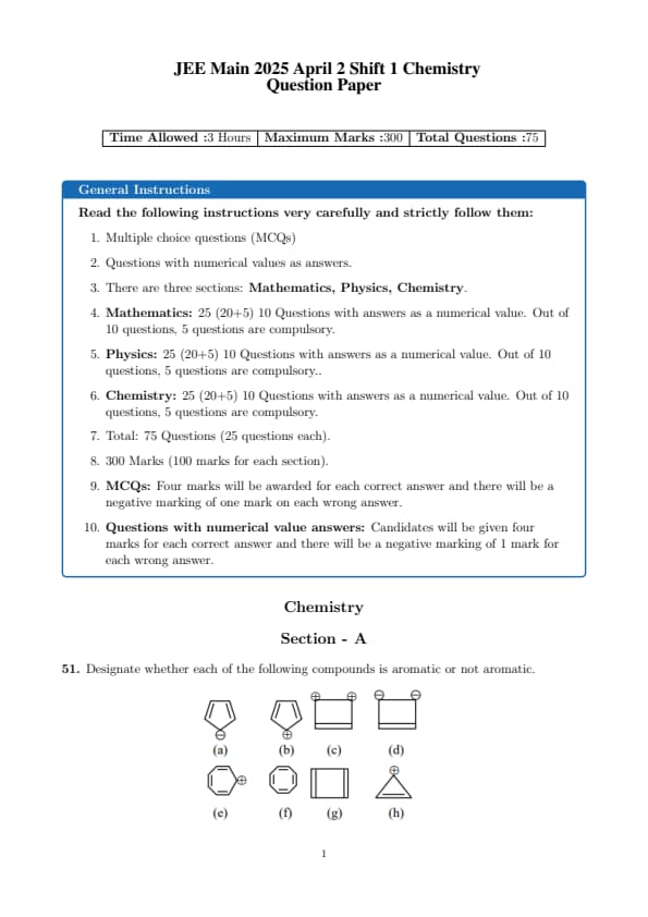 | JEE Main 2025 April 2 Shift 1 Chemistry Question Paper Pdf | Download PDF | View Solution |