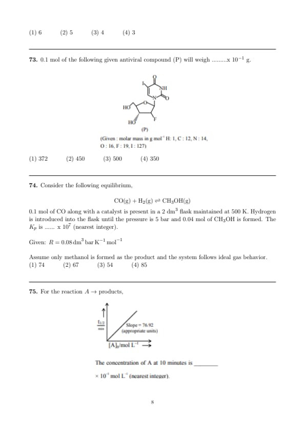 0.1 mol of CO along with a catalyst is present in a 2 dm\(^3\) flask maintained at 500 K. Hydrogen is introduced into the flask until the pressure is 5 bar and 0.04 mol of CH\(_3\)OH is formed. The \( K_p \) is ...... x \( 10^7 \) (nearest integer).