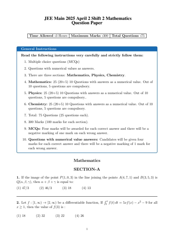 | JEE Main 2025 April 2 Shift 2 Maths Question Paper Pdf | Download PDF | View Solution |