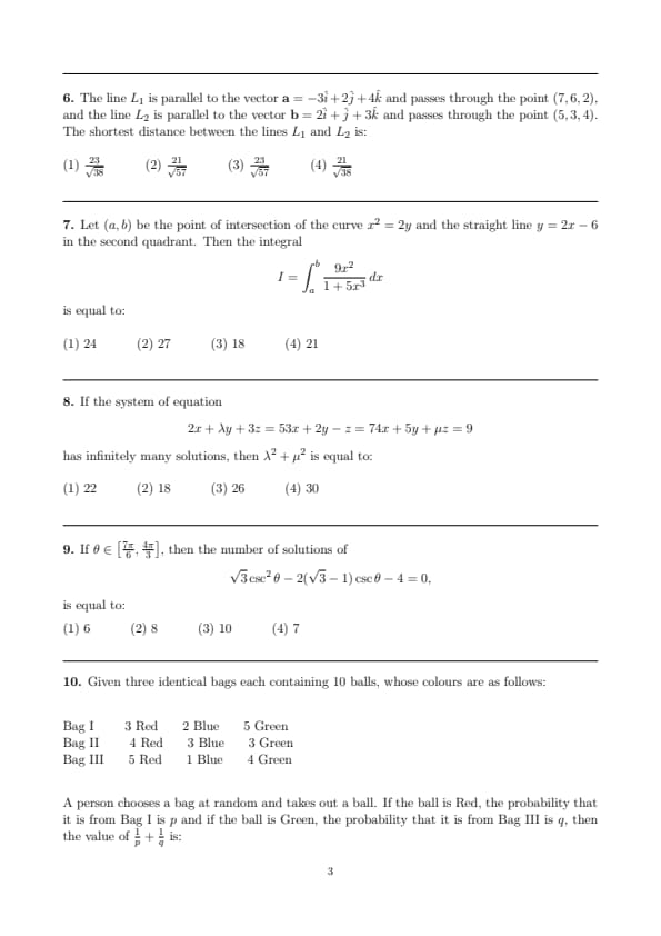 The line \( L_1 \) is parallel to the vector \( \mathbf{a} = -3\hat{i} + 2\hat{j} + 4\hat{k} \) and passes through the point \( (7, 6, 2) \), and the line \( L_2 \) is parallel to the vector \( \mathbf{b} = 2\hat{i} + \hat{j} + 3\hat{k} \) and passes through the point \( (5, 3, 4) \). The shortest distance between the lines \( L_1 \) and \( L_2 \) is: