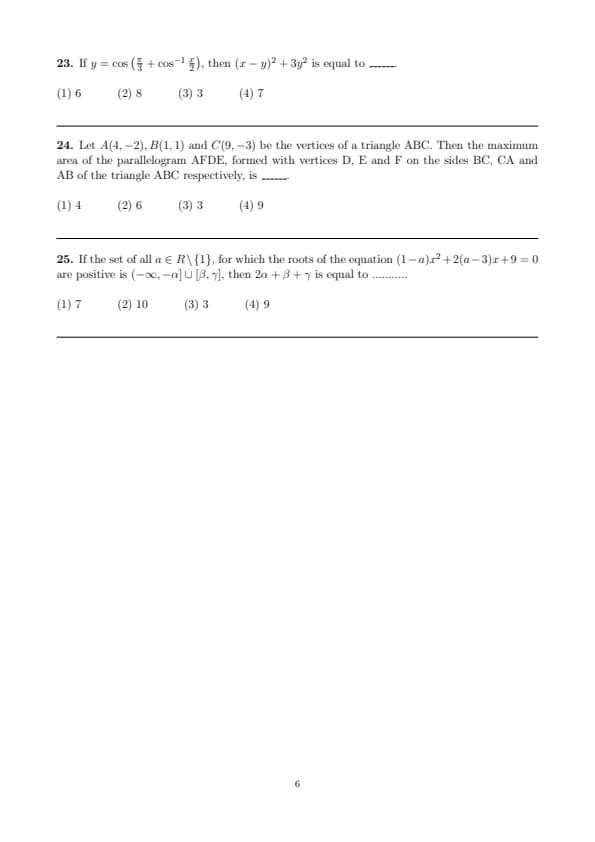 If the set of all \( a \in \mathbb{R} \setminus \{1\} \), for which the roots of the equation \( (1 - a)x^2 + 2(a - 3)x + 9 = 0 \) are positive is \( (-\infty, -\alpha] \cup [\beta, \gamma] \), then \( 2\alpha + \beta + \gamma \) is equal to ...........