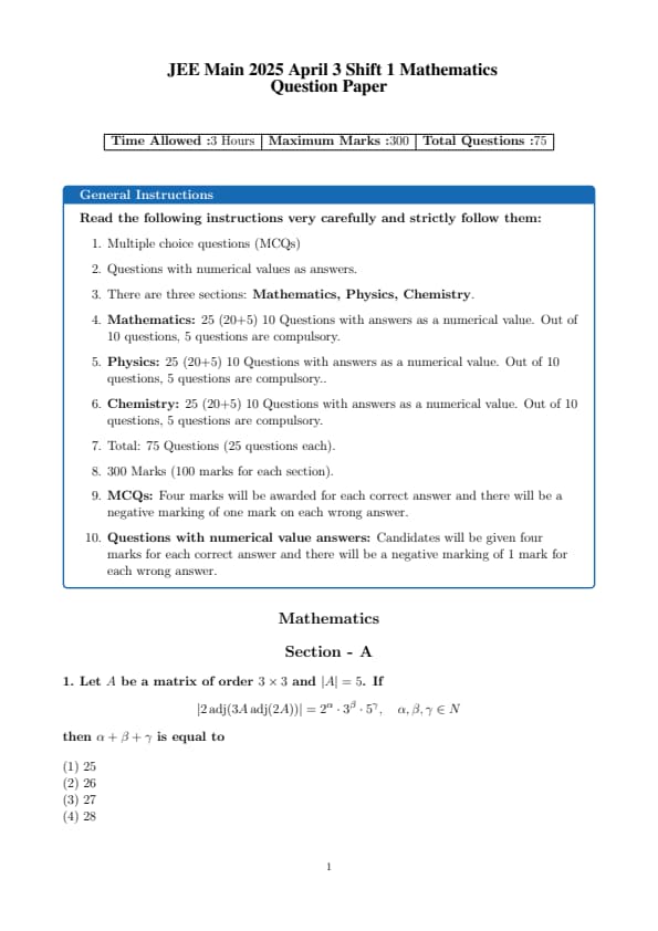 JEE Main 2025 April 3 Shift 1 Maths Question Paper with Solutions