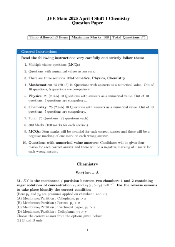 | JEE Main 2025 April 4 Shift 1 Chemistry Question Paper Pdf | Download PDF | View Solution |